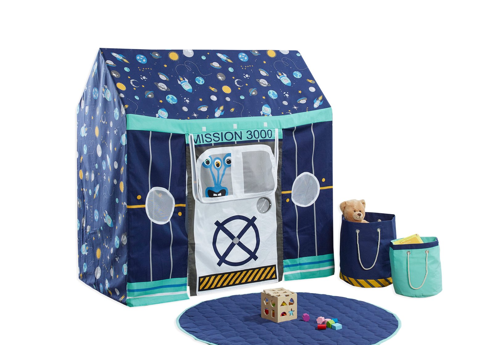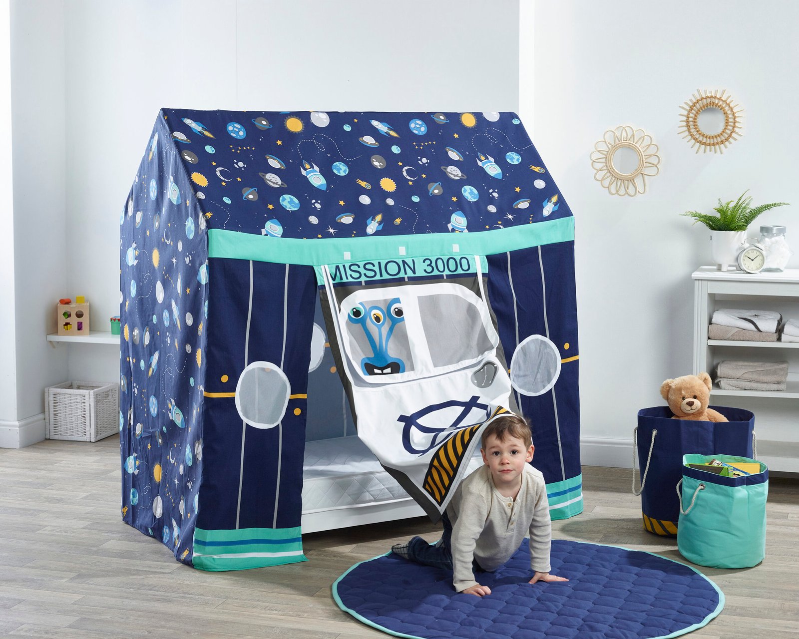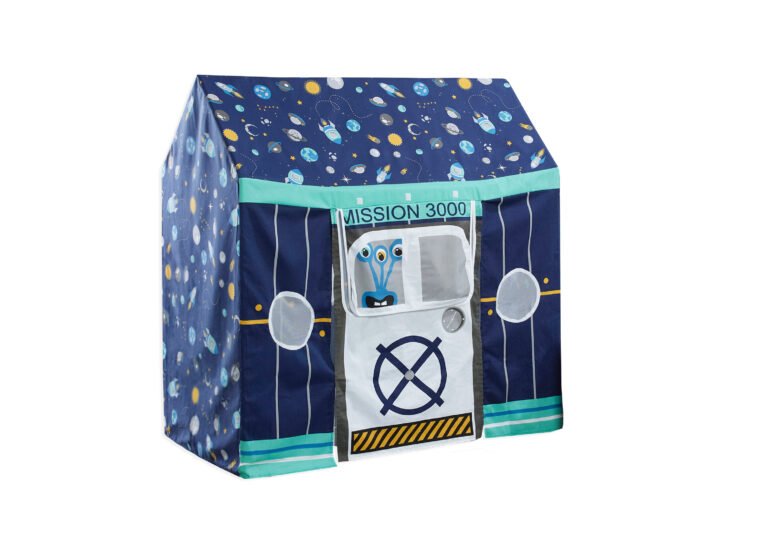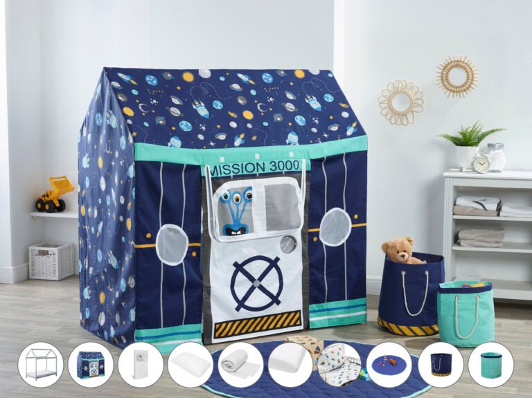 3..2..1.. lift off! With this amazing ‘Space mission 3000’ 12 piece toddler bed house bundle. Your little one will feel like EVERY bedtime is a dream come true! Created by our expert team of British designers this bed is sturdy and well built, low to the ground and has a house shaped frame. The Space themed cover has mesh panel windows, a large side door and is perfect for creating a space they will feel so comfy in.