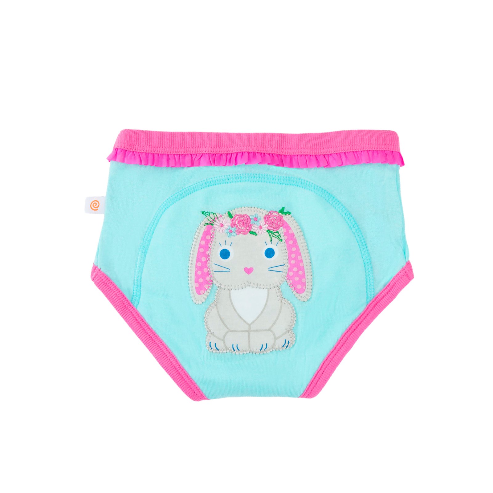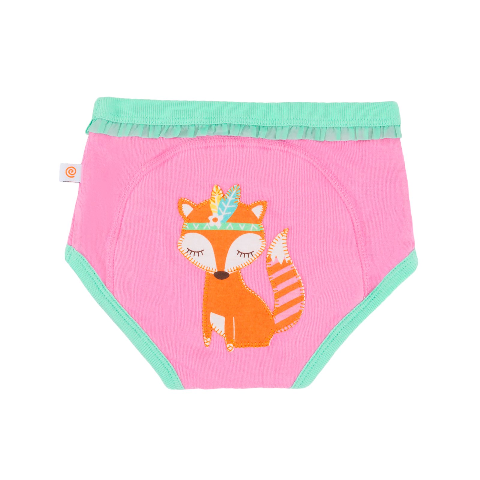 Good-bye diapers! Hello “My First Pair of Underwear” Made from super soft cotton spandex stretch rib using Certified Organic Control Standard OCS100 ORGANIC COTTON, our training pants are perfect for that potty training time in a child’s life. What do you use when diapers are needed less and underwear is just too risky? Give them their My First Pair of Underwear. Experts say that after a few weeks of successful potty breaks, a child may be transitioned into training pants before going into regular underwear. Not just training pants, your childs First Pair of Underwear! Available in a variety of animal characters and in sizes 2-4 Years, our unique training pants are made of Super Soft Organically grown Cotton, and have a layer of double sided 80/20 Cotton/Polyester blend terry sandwiched between the layers of organic cotton for extra absorbency where it’s needed most to stop leaks, in case an accident occurs. The perfect stepping stone in the potty training process. Cute animal character, with a turn me around feature on back! Fun bright colors and elevated embroideries make potty-training more fun! Super comfortable in organically grown cotton with a soft fully elastic waistband. ZOOCCHINI’s organic potty-training pants provide you with the quality, design, flexibility and durability you are looking for. Makes a great everyday gift! Ages 2T/3T: Fits approx. 26-33 lbs Ages 3T/4T: Fits approx. 30-37 lbs Package Includes: Set of 3 Organic Cotton Potty Training Pants Designed in the USA