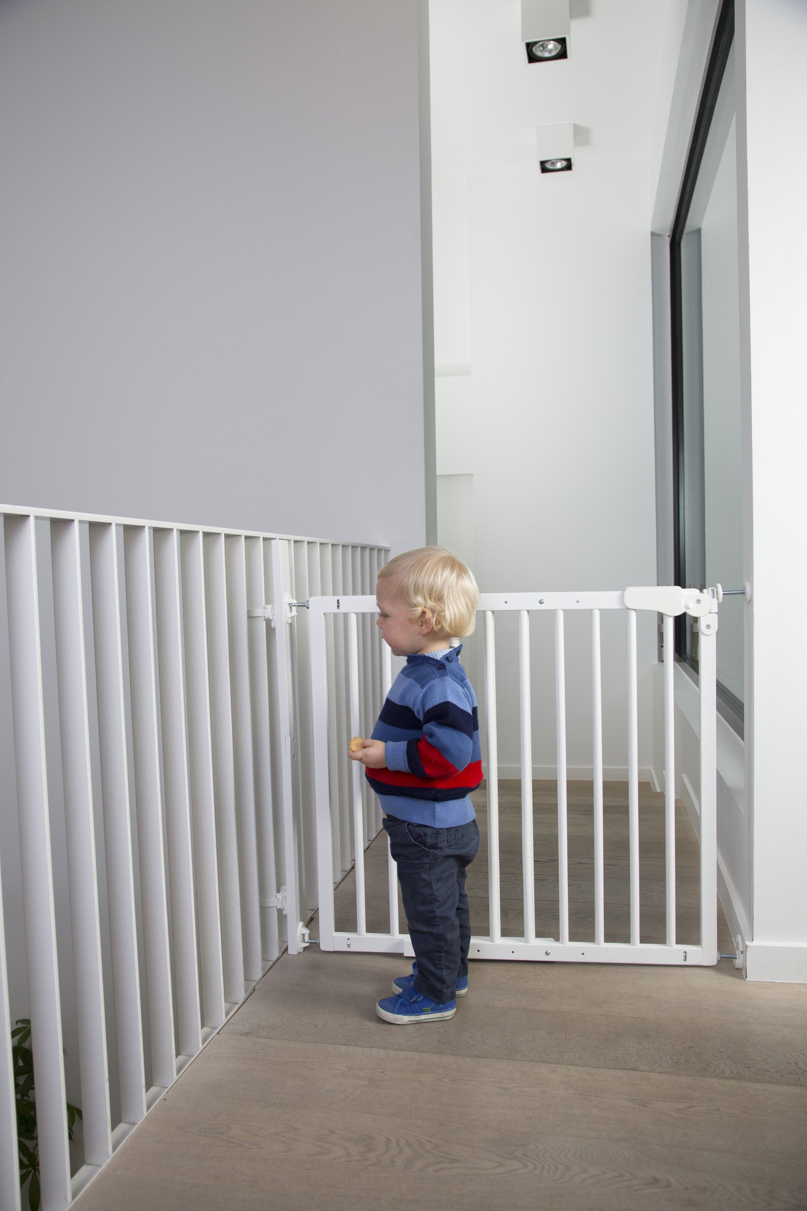 The Maestro wooden safety gate is a versatile, secure solution designed to keep children safe around doorways and staircases. This thoughtfully designed gate can be used as both a doorway barrier and a stairgate, and is suitable for installation at the top or bottom of stairs. With an adjustable width range of 73.5 cm to 104 cm, Maestro adapts easily to various spaces, making it a convenient option for different areas in your home.
