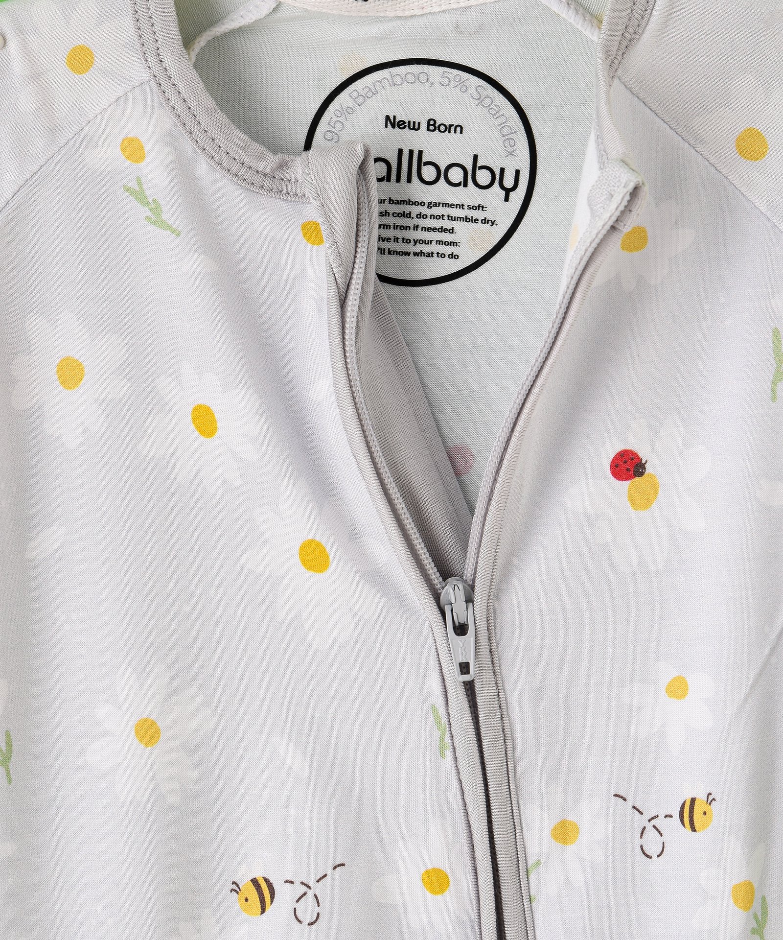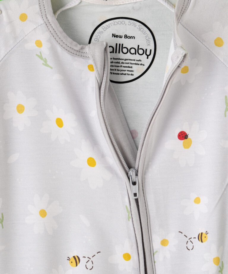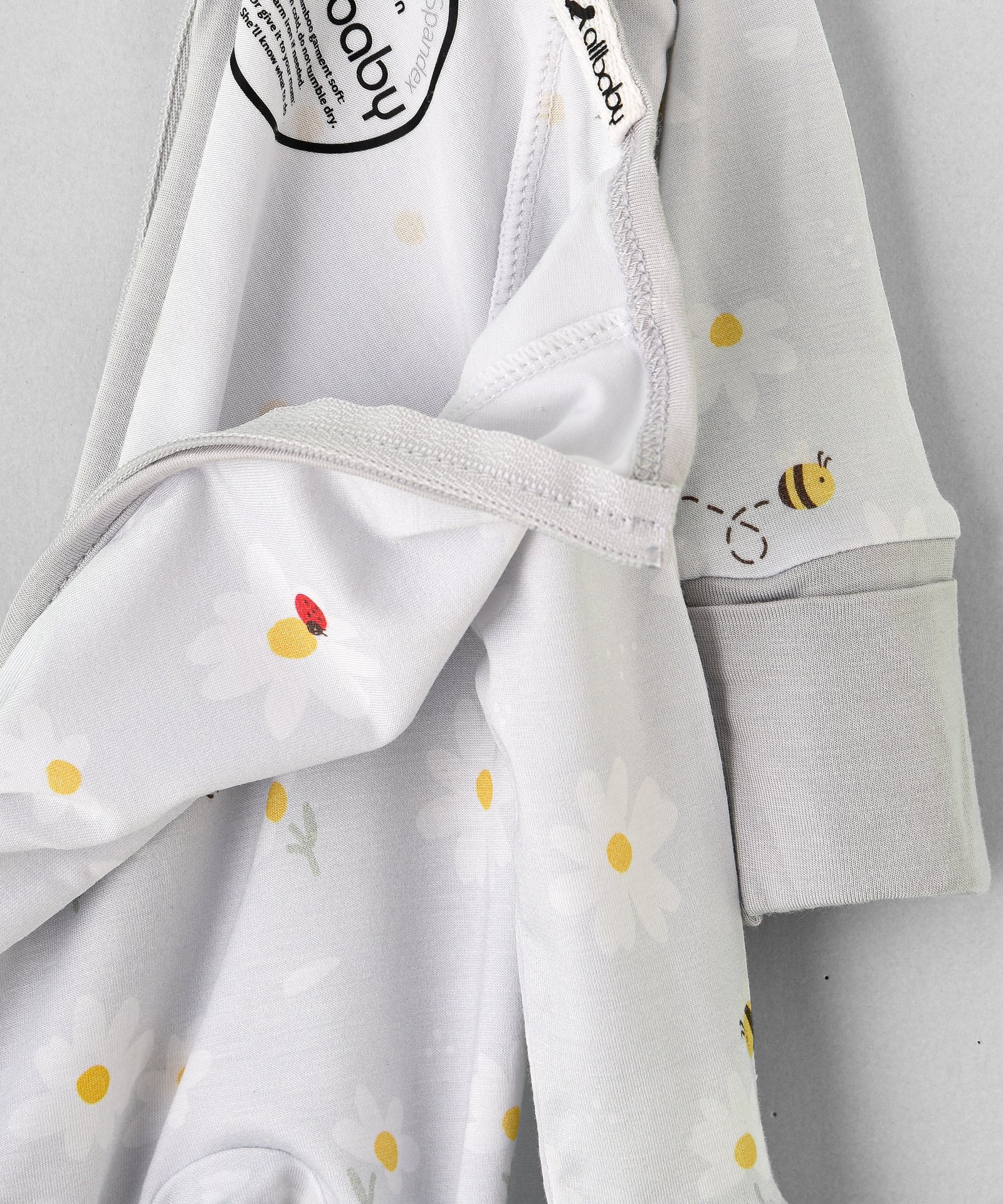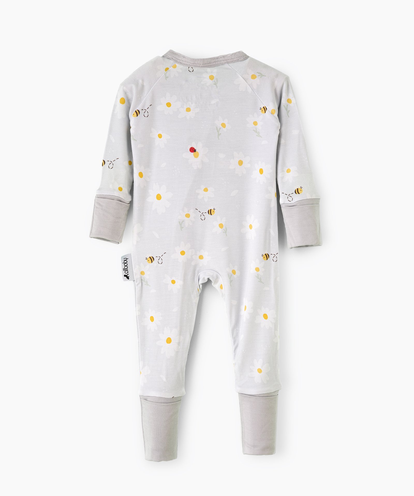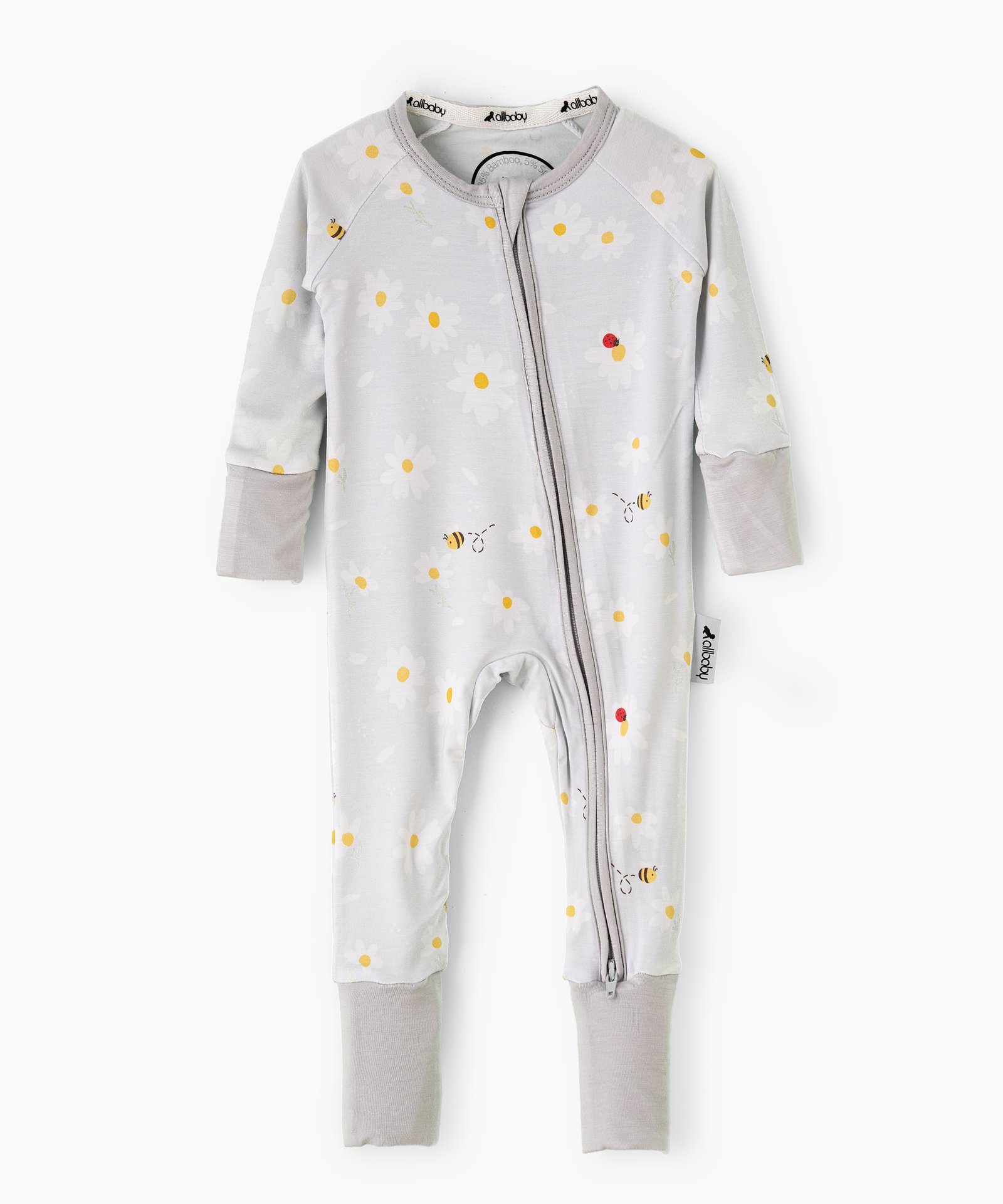 Our playful Daisy bee print sleepsuit is as sweet as a summer meadow and has been designed exclusively for Allbaby.  Our printed baby sleepsuits are made from the softest stretch bamboo fabric for ultimate comfort and restful nights and come in a range of cute modern designs. Featuring inbuilt scratch mitts and turn over footies, as well as a two-way zipper with zip guard making those nighttime nappy changes easy and wake-free.