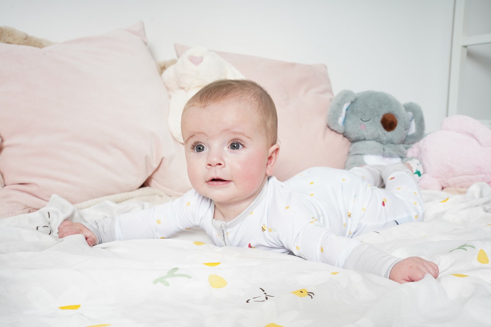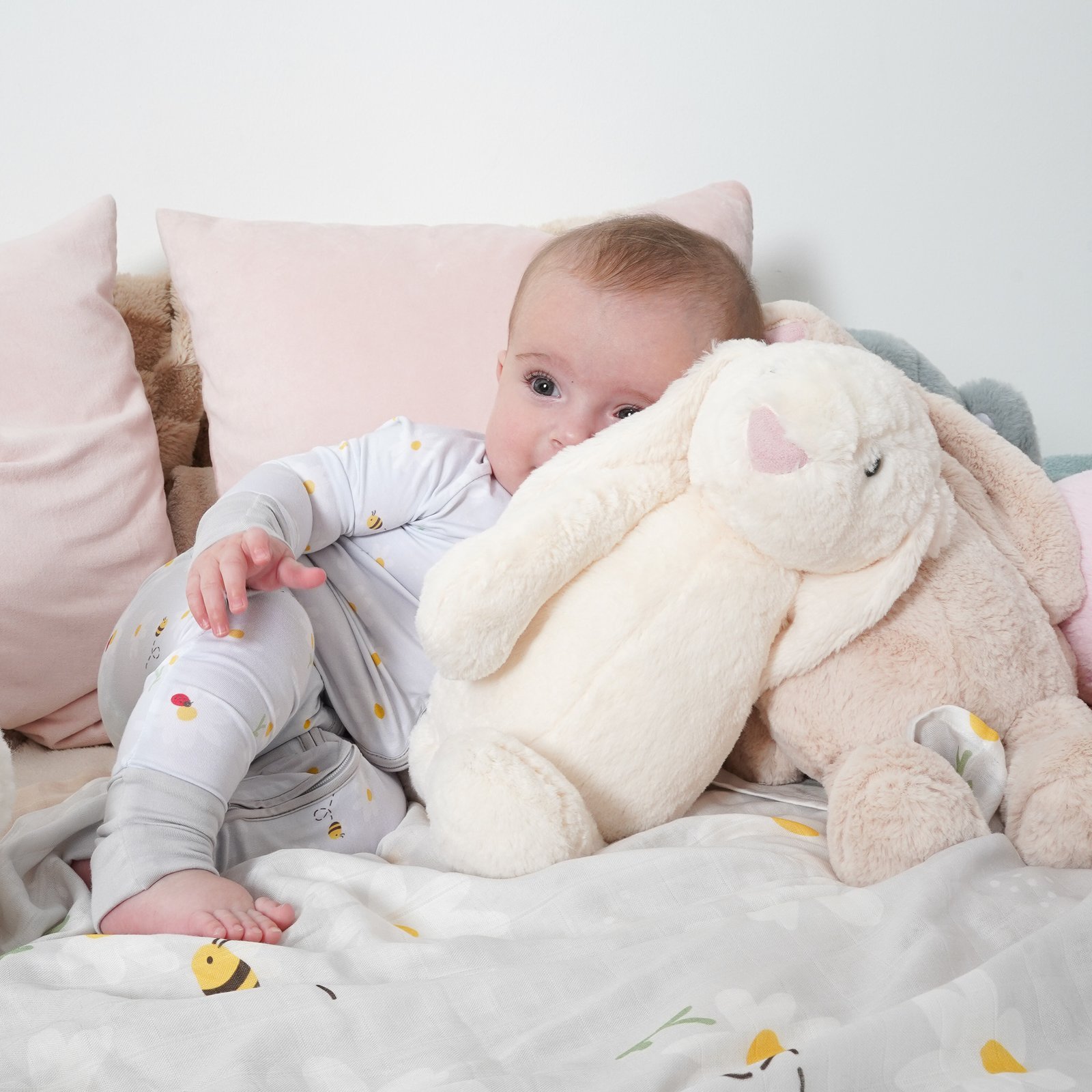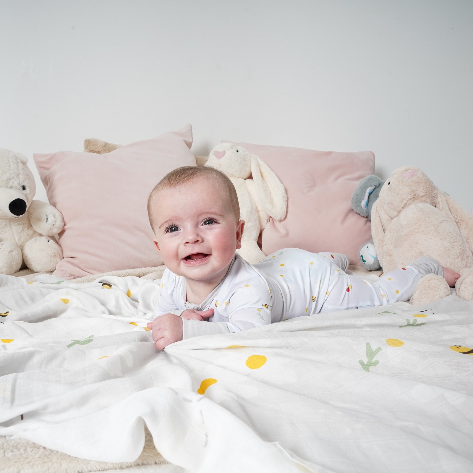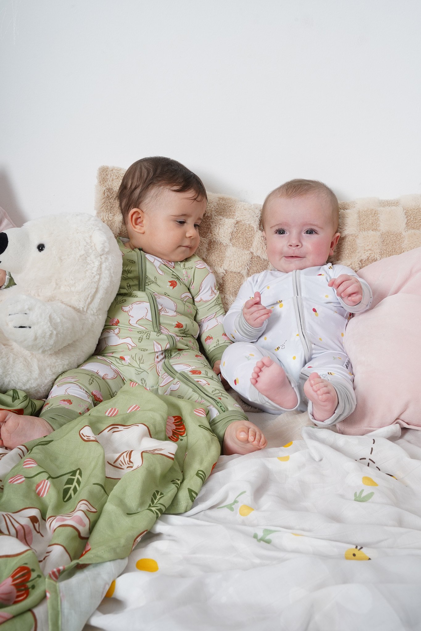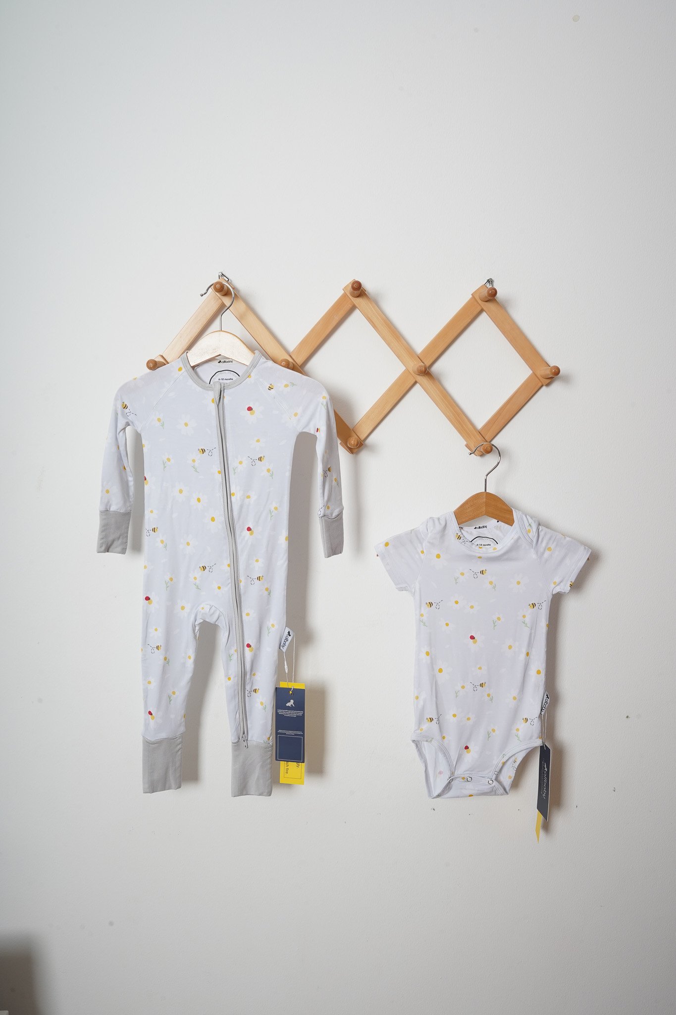 Our playful Daisy bee print sleepsuit is as sweet as a summer meadow and has been designed exclusively for Allbaby.  Our printed baby sleepsuits are made from the softest stretch bamboo fabric for ultimate comfort and restful nights and come in a range of cute modern designs. Featuring inbuilt scratch mitts and turn over footies, as well as a two-way zipper with zip guard making those nighttime nappy changes easy and wake-free.