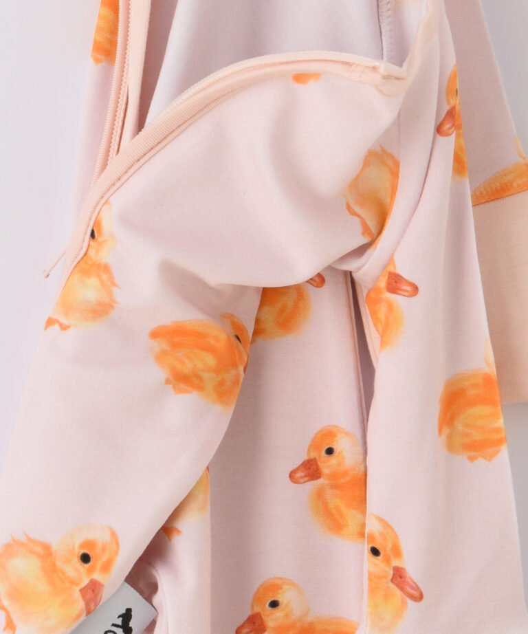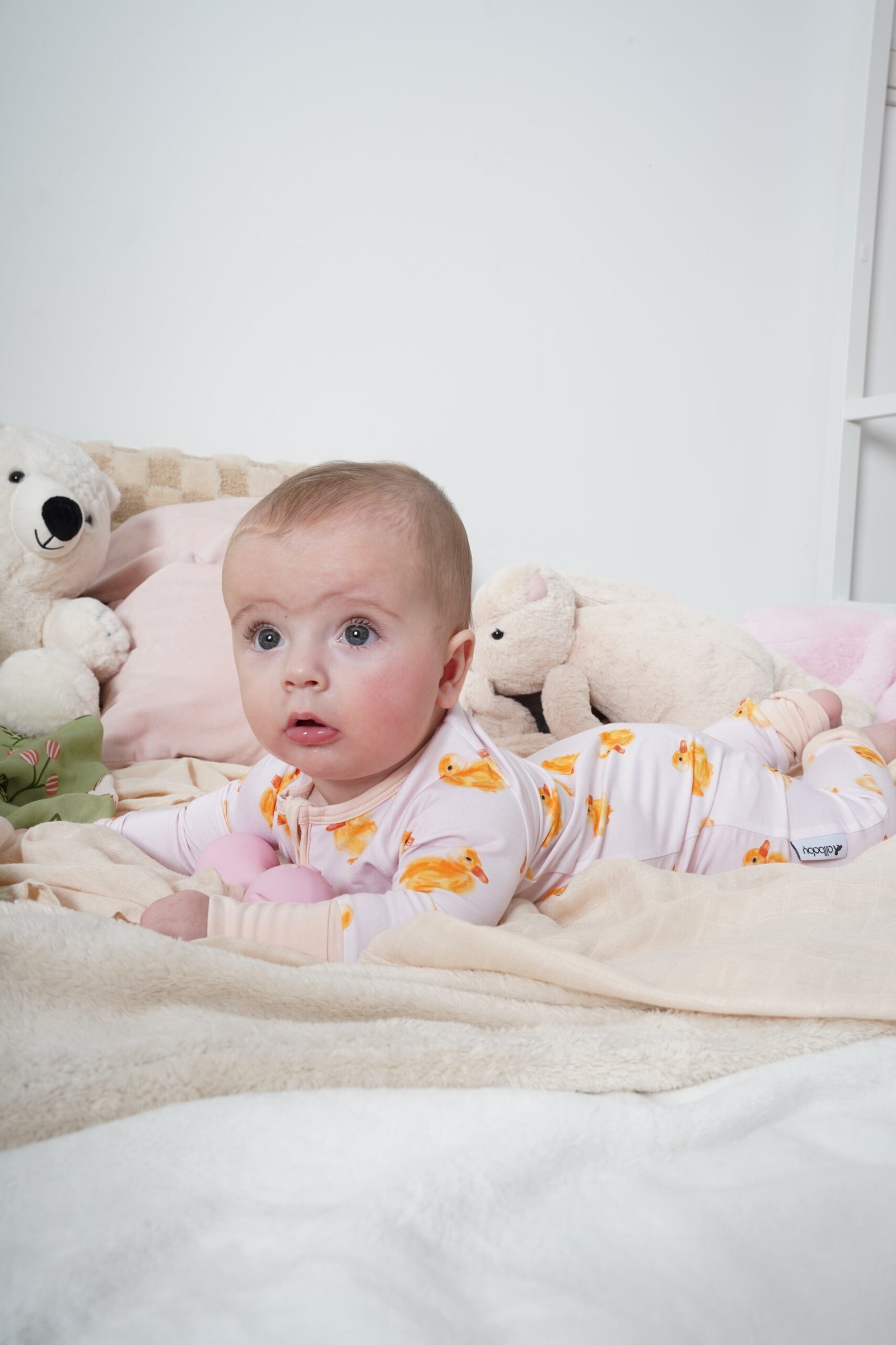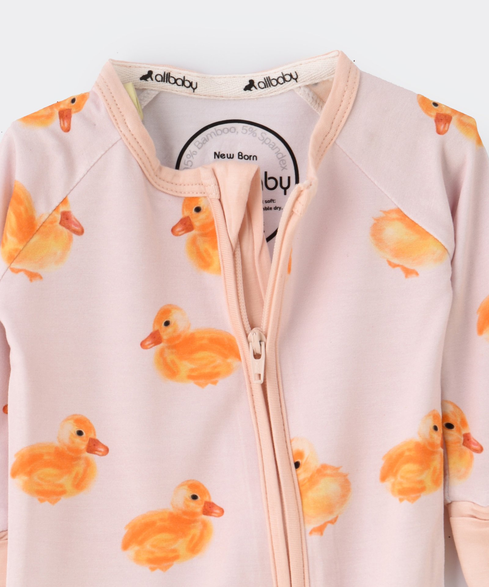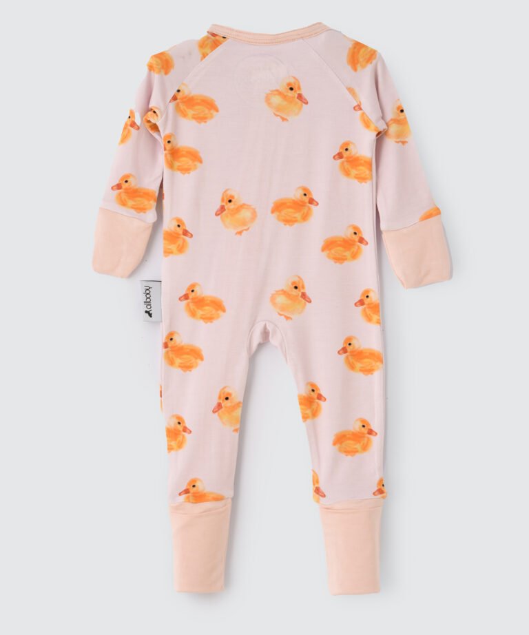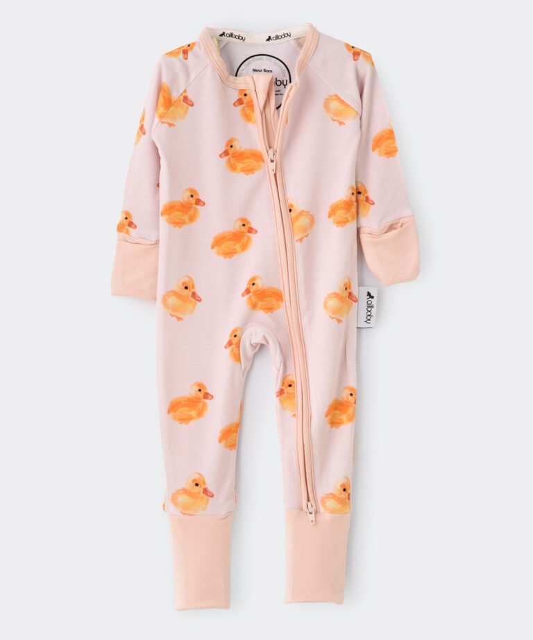 Add a splash of joy and fun to bedtime with our cheerful rubber duck print sleepsuit, designed exclusively for Allbaby. Our printed baby sleepsuits are made from the softest stretch bamboo fabric for ultimate comfort and restful nights and come in a range of cute modern designs. Featuring inbuilt scratch mitts and turn over footies, as well as a two-way zipper with zip guard making those nighttime nappy changes easy and wake-free.Â