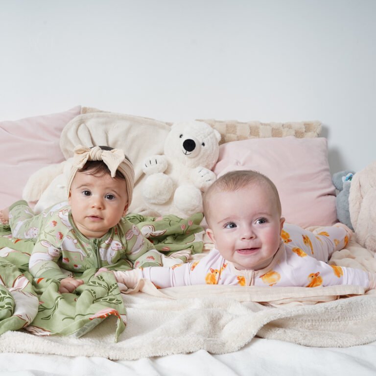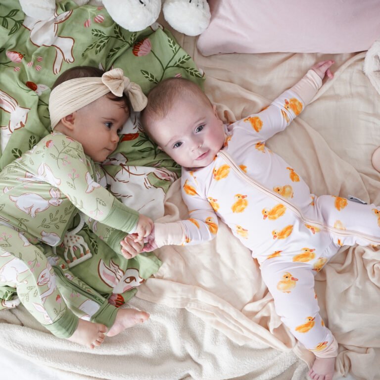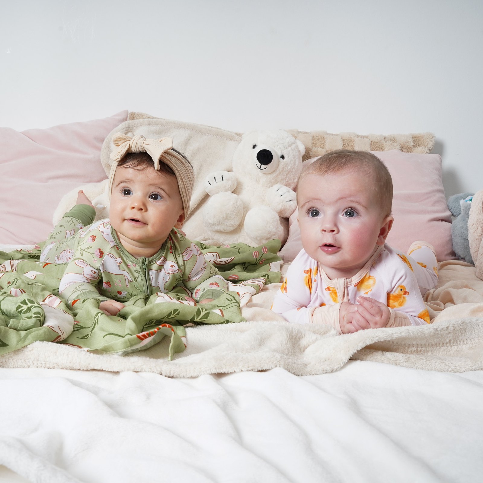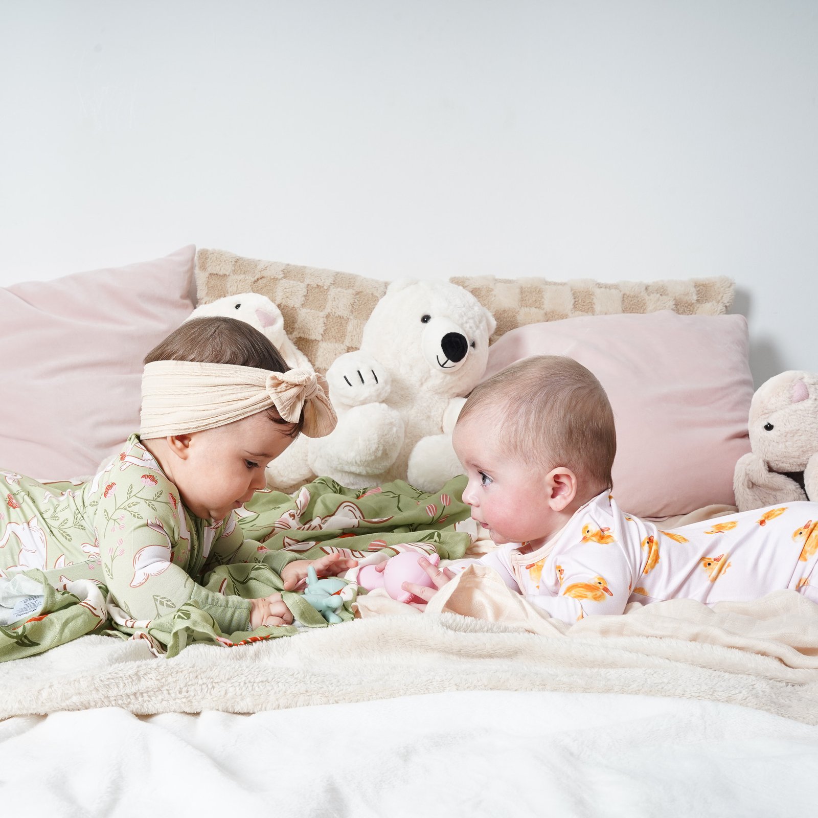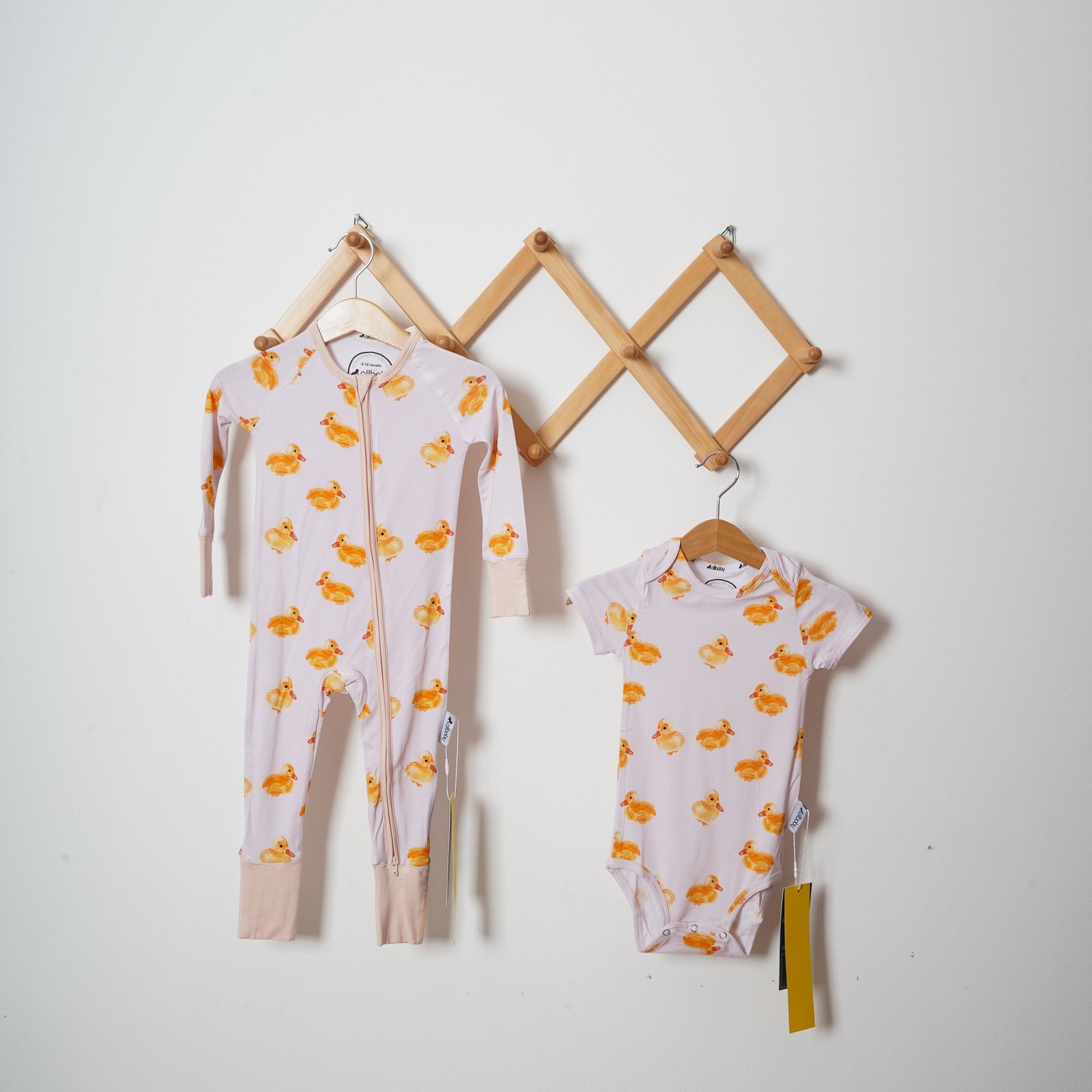 Add a splash of joy and fun to bedtime with our cheerful rubber duck print sleepsuit, designed exclusively for Allbaby. Our printed baby sleepsuits are made from the softest stretch bamboo fabric for ultimate comfort and restful nights and come in a range of cute modern designs. Featuring inbuilt scratch mitts and turn over footies, as well as a two-way zipper with zip guard making those nighttime nappy changes easy and wake-free.Â