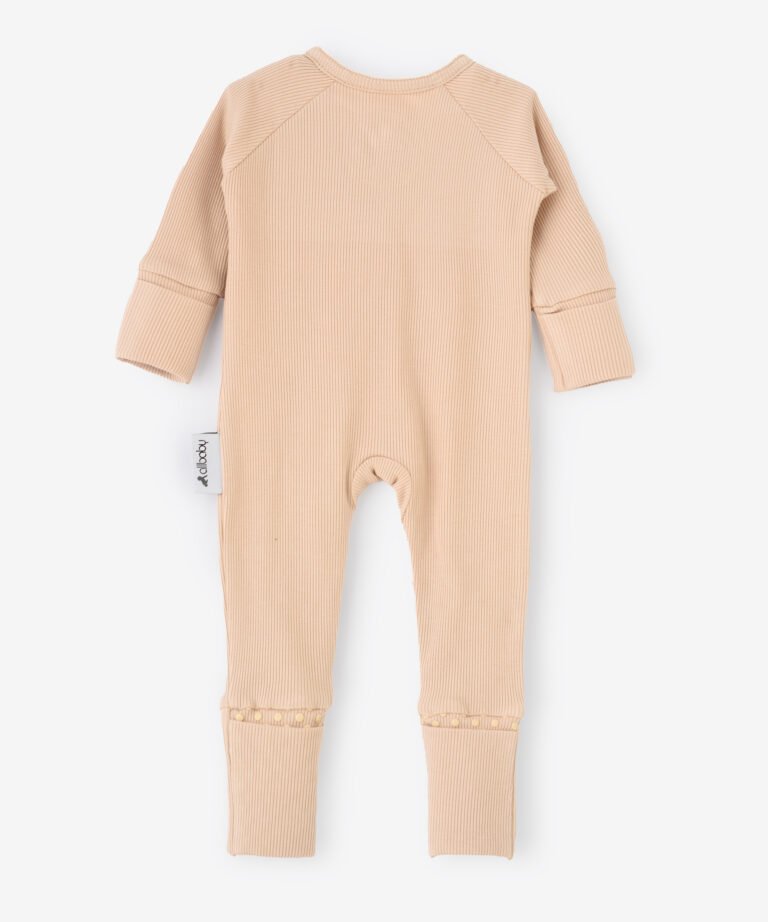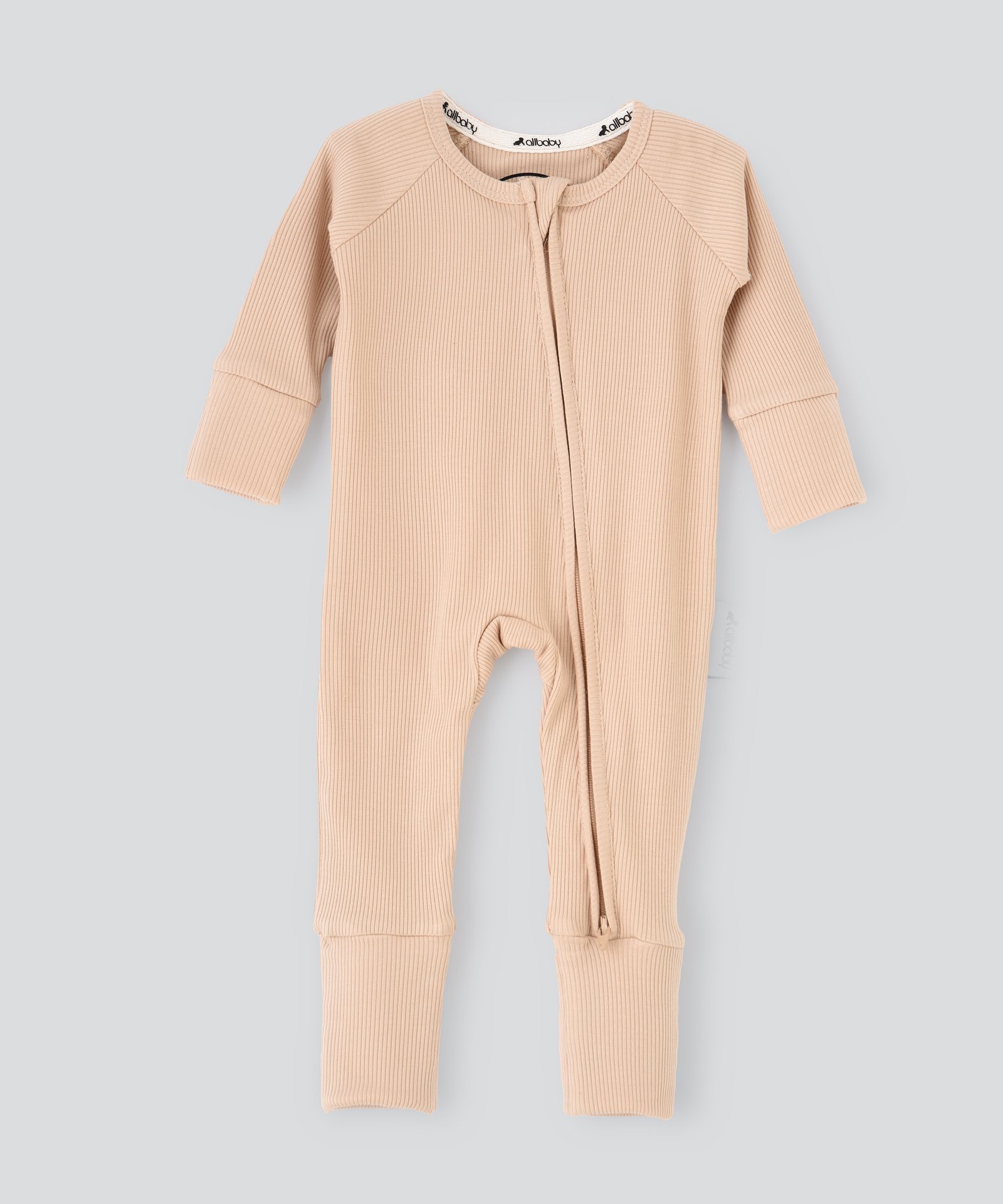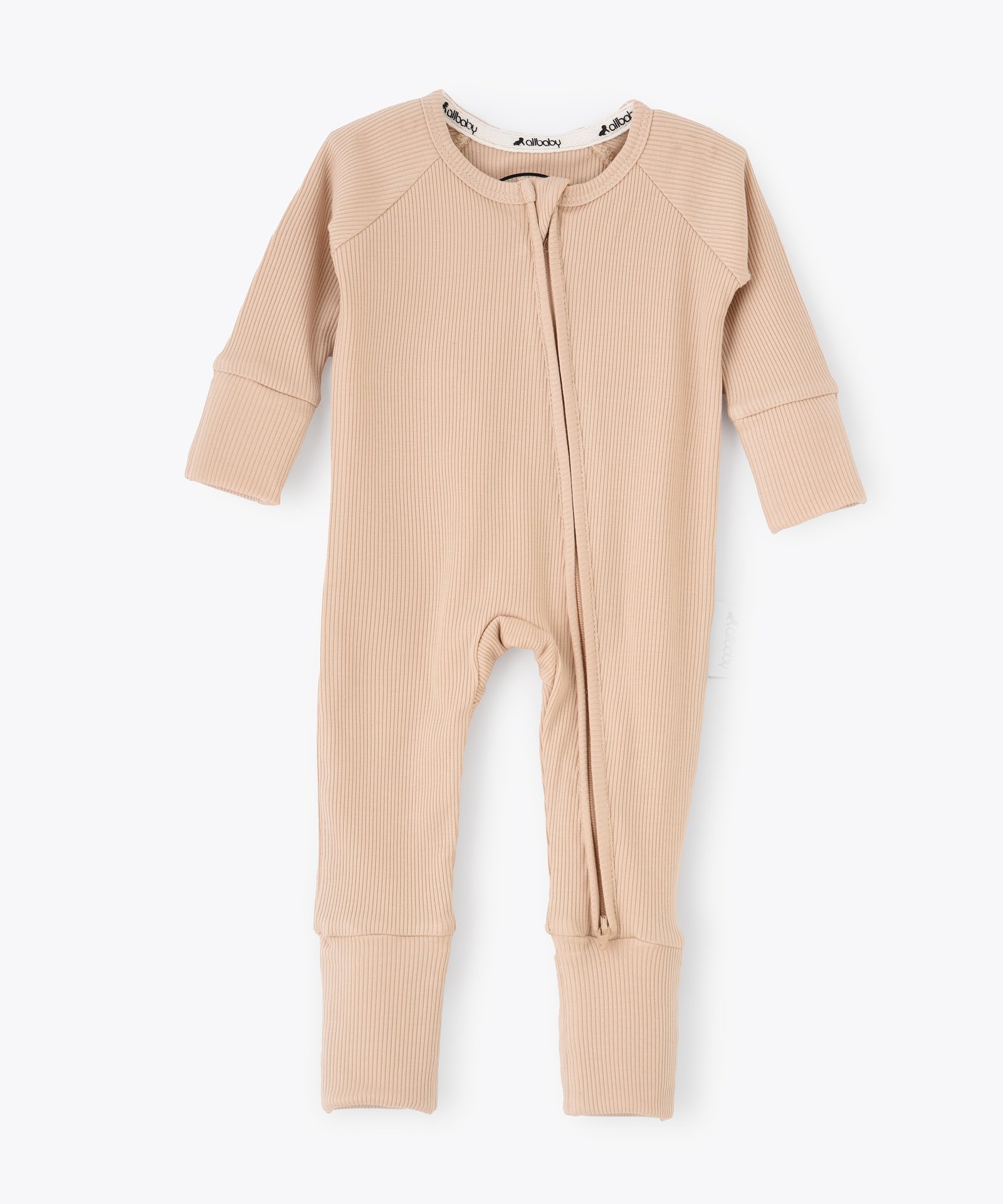 Our ribbed baby sleepsuits are made from the softest stretch bamboo fabric for ultimate comfort and restful nights and come in four classic shades. Featuring inbuilt scratch mitts and turn over feet, as well as a two-way zipper with zip guard making those nighttime nappy changes easy and wake-free.Â