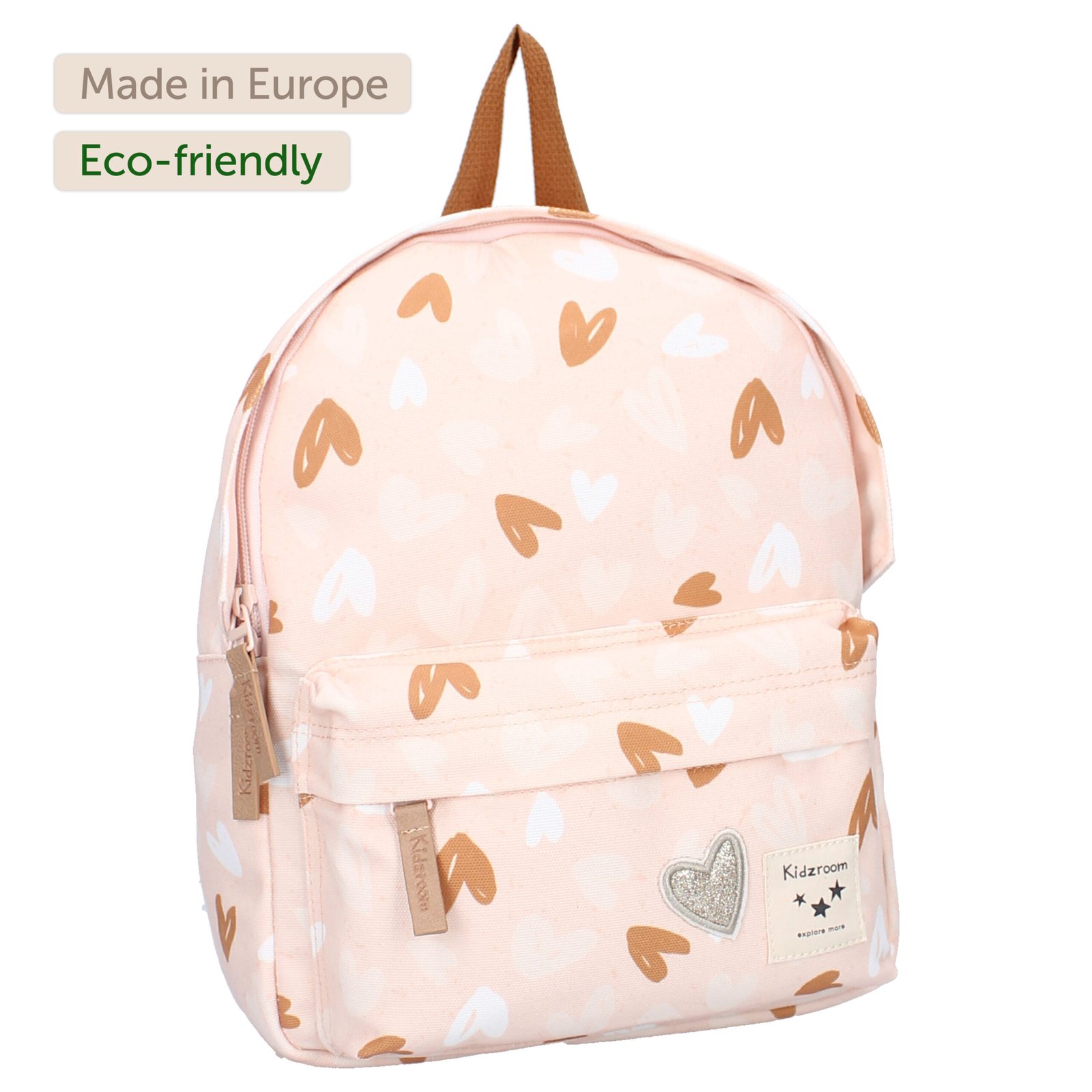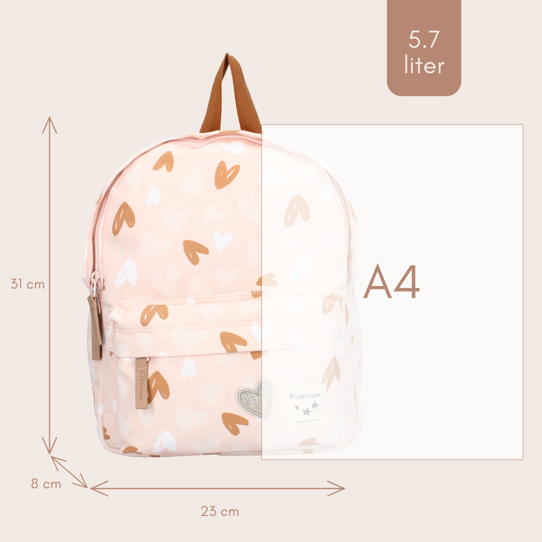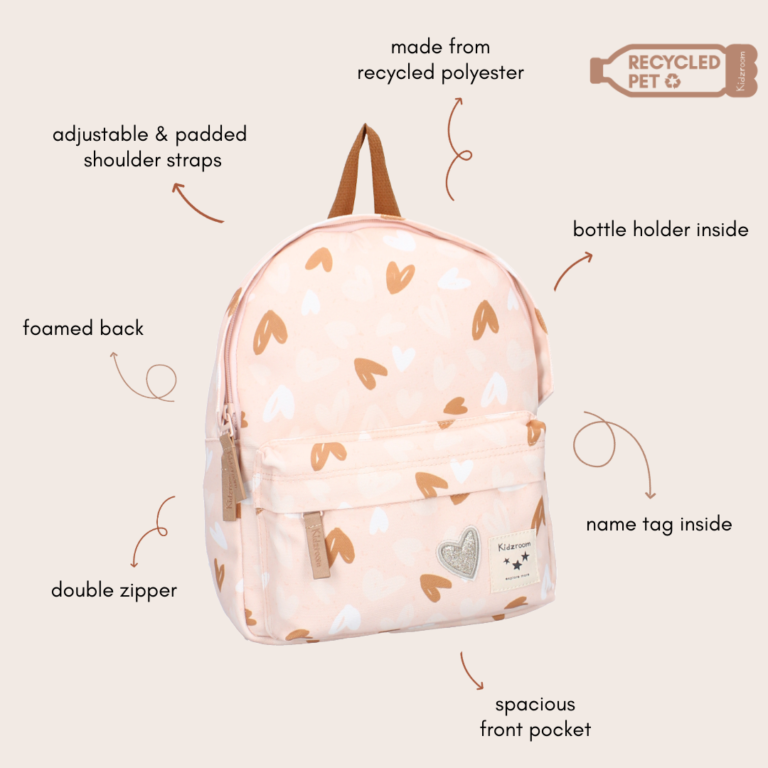 This Kidzroom Backpack with Hearts will surely become your kid’s favorite one. The large main compartment has a double zipper and offers space for a lunch box or extra set of clothes. It has a handy front zipped pocket for smaller items. This backpack is perfect for school or traveling. The backpack can be carried by the loop at the top or on the back with the adjustable shoulder straps. It has a zip on the inside for small items and a label for name and phone number, so everyone knows who this trendy bag belongs to. This backpack is lined for better quality and longer life.