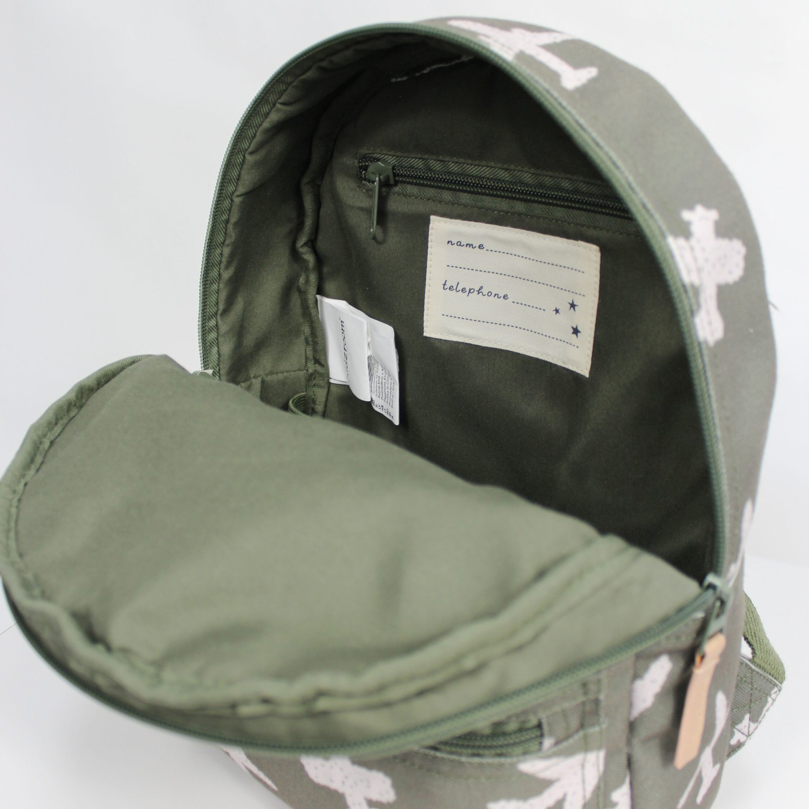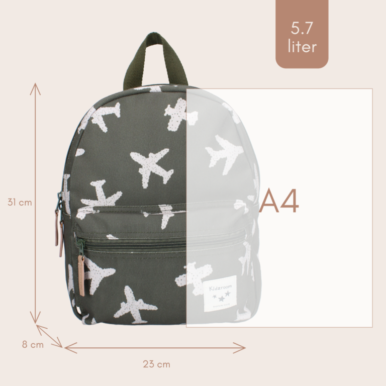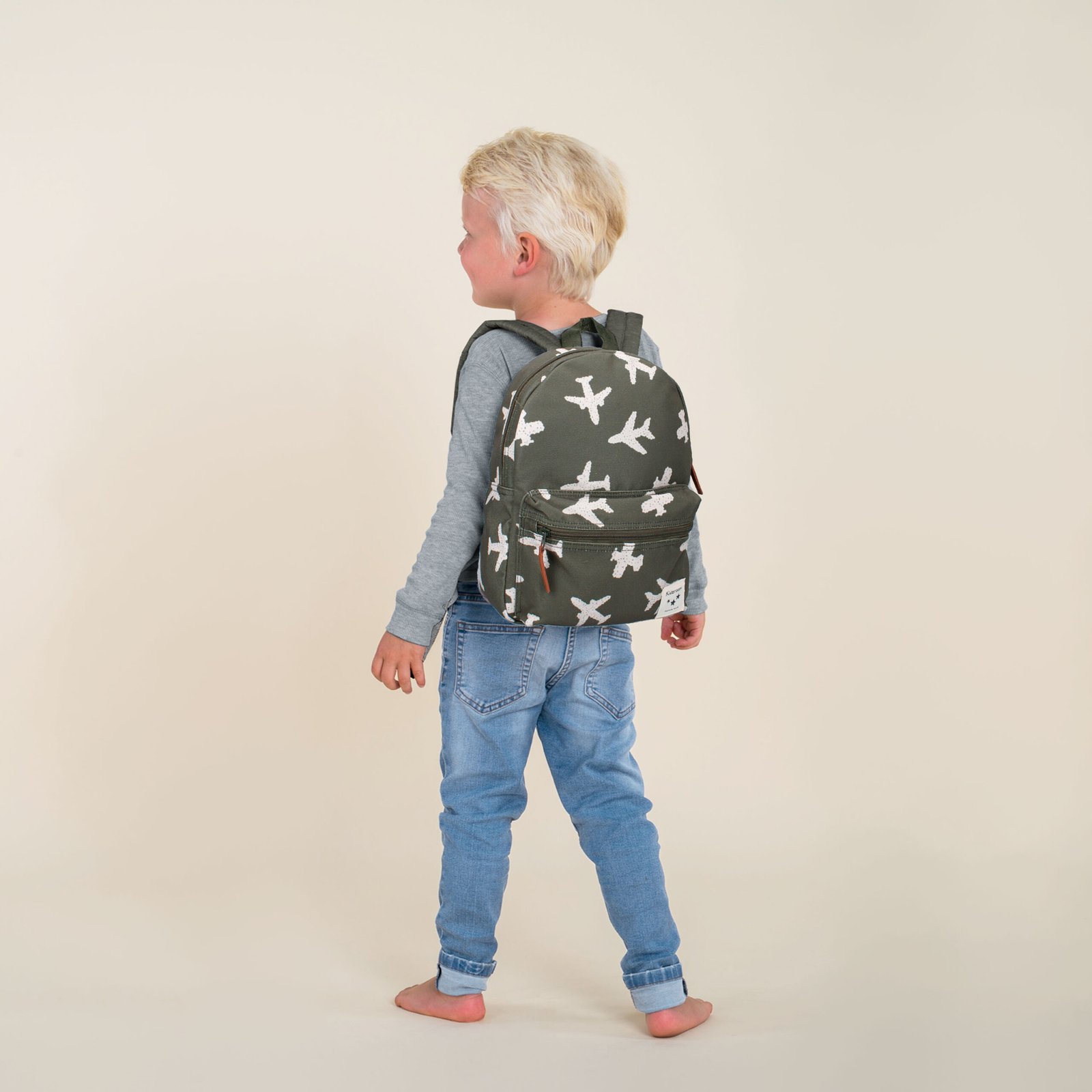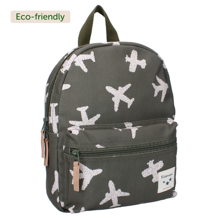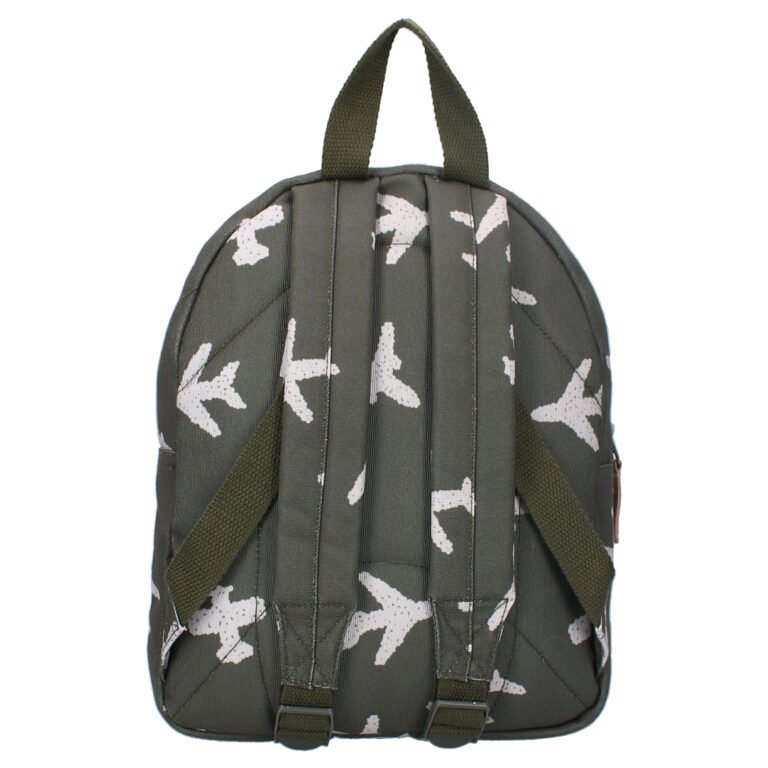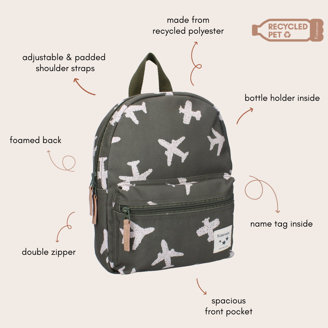 This Army green Kidzroom backpack from the Sweet Cuddles collection is designed with cute all-over Planes prints.