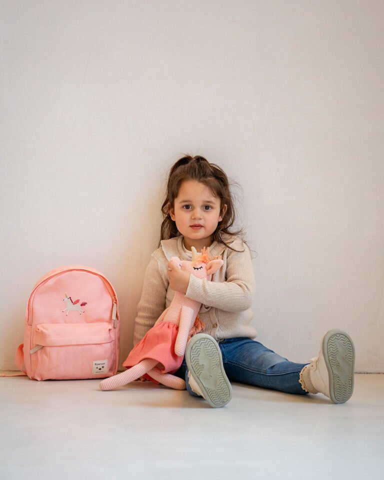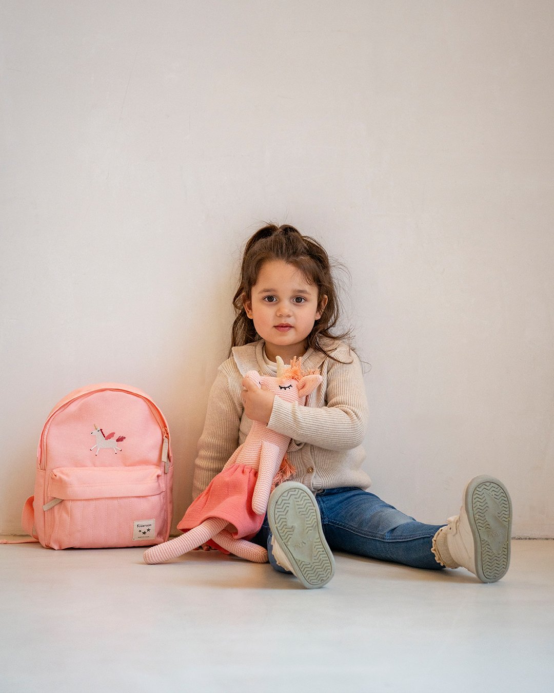 This cute backpack from Kidzroom with Stella the Unicorn design is from the Tattle and Tales collection. The bag is perfect for children who love to have fun. This item is designed pink in colour and features a large main compartment that closes with a zip and has a print of Stella the unicorn. At the front of the bag is an extra compartment that also closes with a zip. Furthermore, the bag has adjustable shoulder straps and a loop at the top. Moreover, the bag has an inner lining that includes a name tag. There is also an elastic pocket in the bag for a drinking bottle. The bag is lined for better quality and longer durability. Finally, the Unicorn Stella can also be seen on a blanket and in the form of a soft toy. So you can collect the whole set!