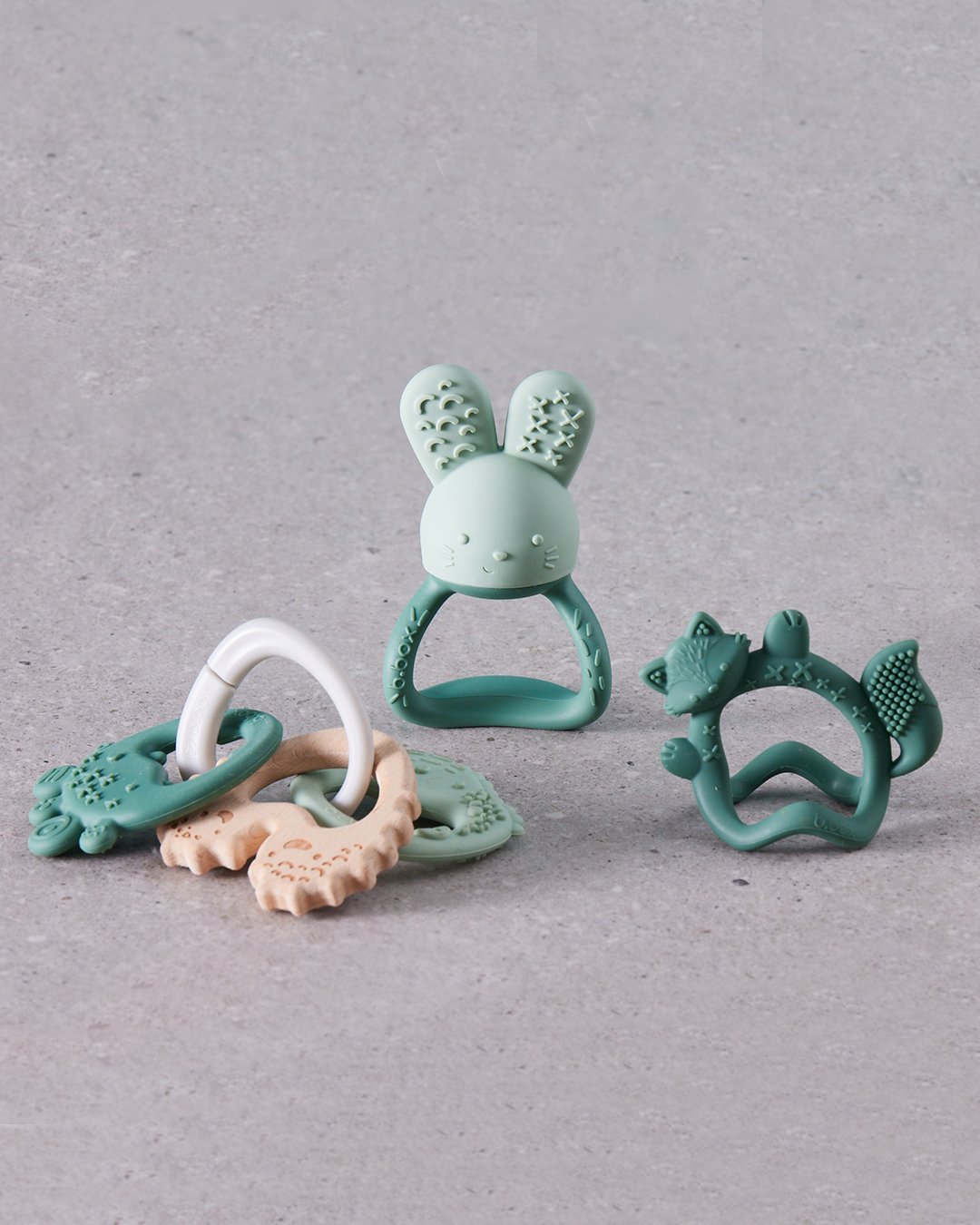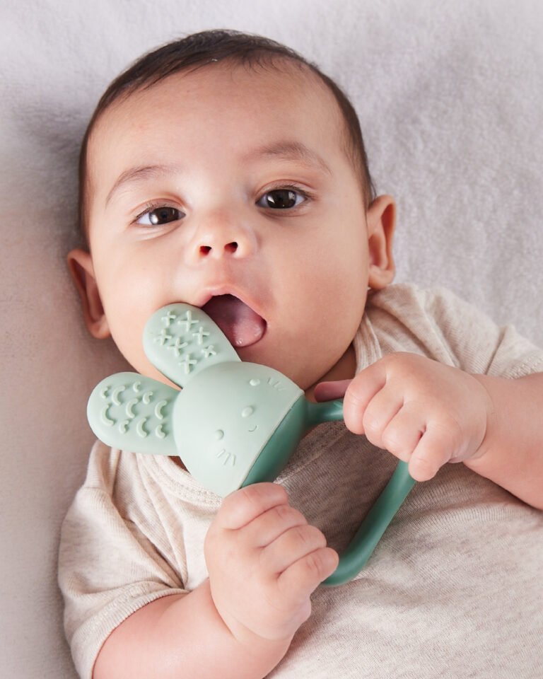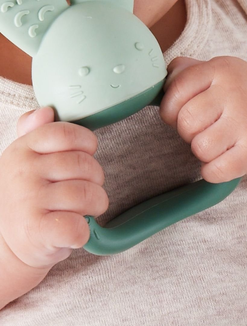 Crafted from soft, food-grade silicone, the textured bunny ears are perfectly safe for babies to chew on, reaching all areas of the mouth while offering varied sensations that massage and relieve sore gums. With a solid base handle, it’s easy for tiny hands to grasp from any angle, ensuring the teether stays upright and hygienic on flat surfaces.