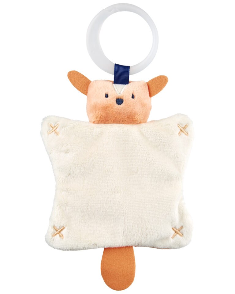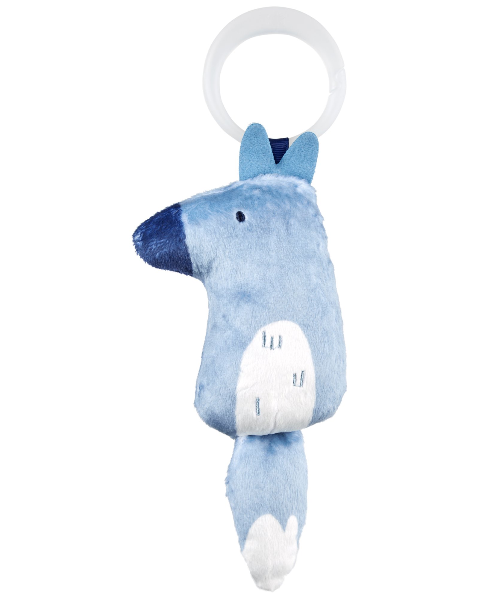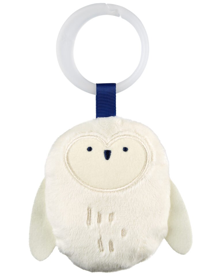 – 5 hanging toys include: Metallic musical star with tactile ribbons, Sugar glider lovey, Rattle raccoon with star teether toy, Wolf with chime, Snow owl with crinkle