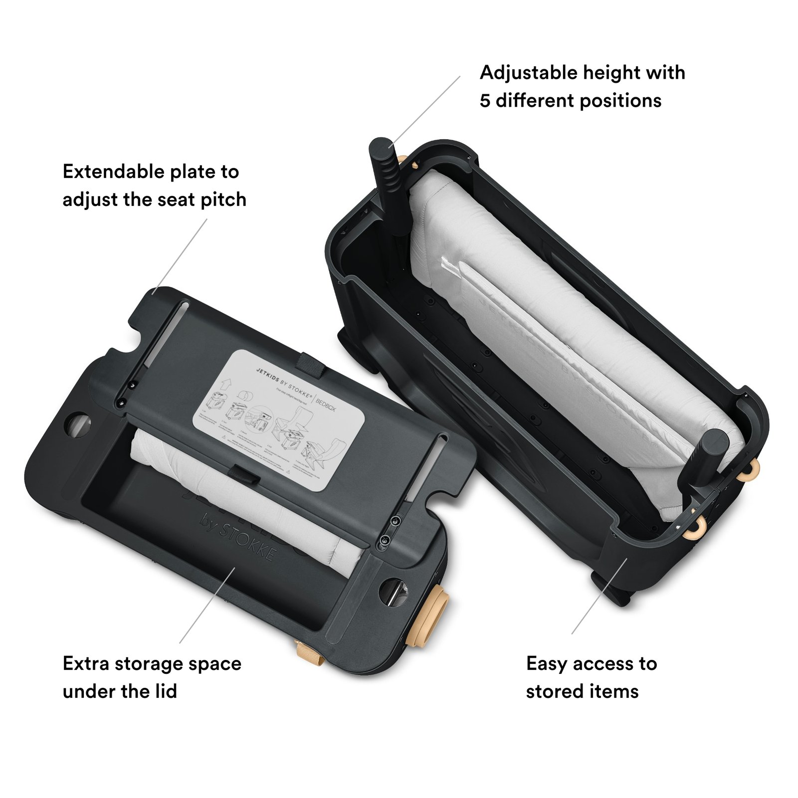 ‘Before you goPersonalize the BedBox™ with the stickers includedSpacious interior to store essentials for the journeyNEW FEATURE: Practical storage room inside the lidGetting aroundShock absorbing front swivel wheels allows excellent manoeuvringMulti-purpose adjustable strap allows for carrying or pulling of the BedBox™Top handle for child to hold while ridingTired feet can rest on the comfortable foot ledgeDuring travelFor use in planes, trains and ferries, where a seat extender is convenientUniversal and fits most standard economy seats in aircraftsThe extendable lid elongate the seat to create a larger surface areaMattress and soft side panels create a comfortable space on the seatSeat belt…