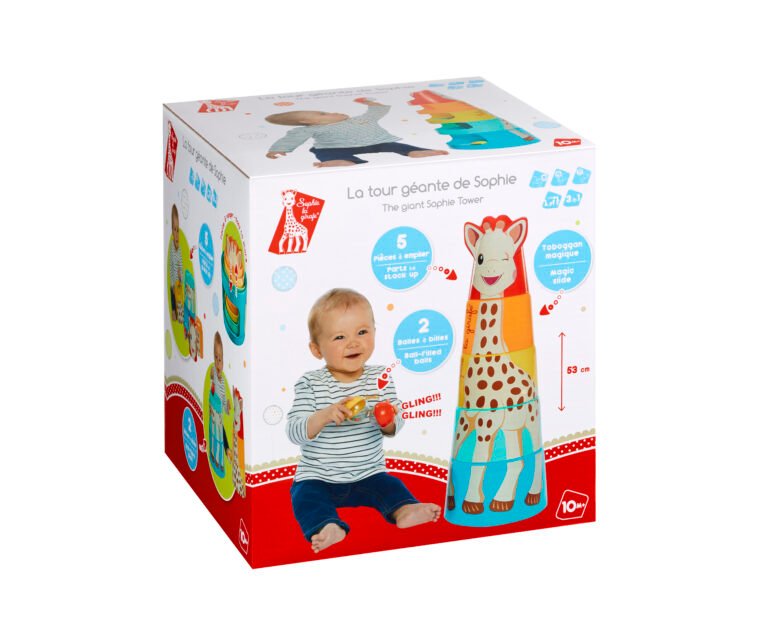 A puzzle: Baby will have fun to rebuilding Sophie la girafe by aligning the different body parts (head, neck, legs ).Balls game: 2 balls with marbles to put at the top of the tower and which will hurtle the stages one by one thanks to the magical toboggan.
