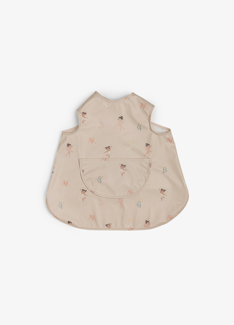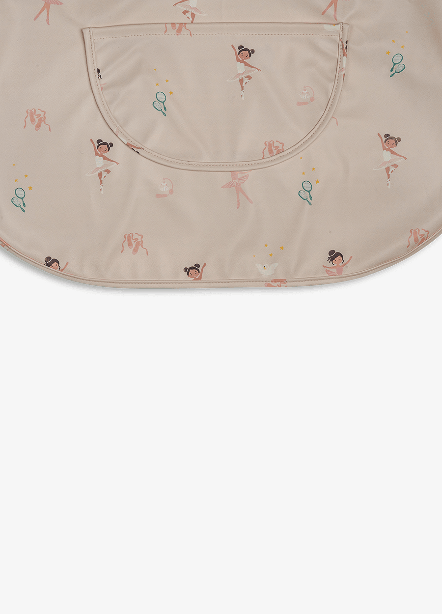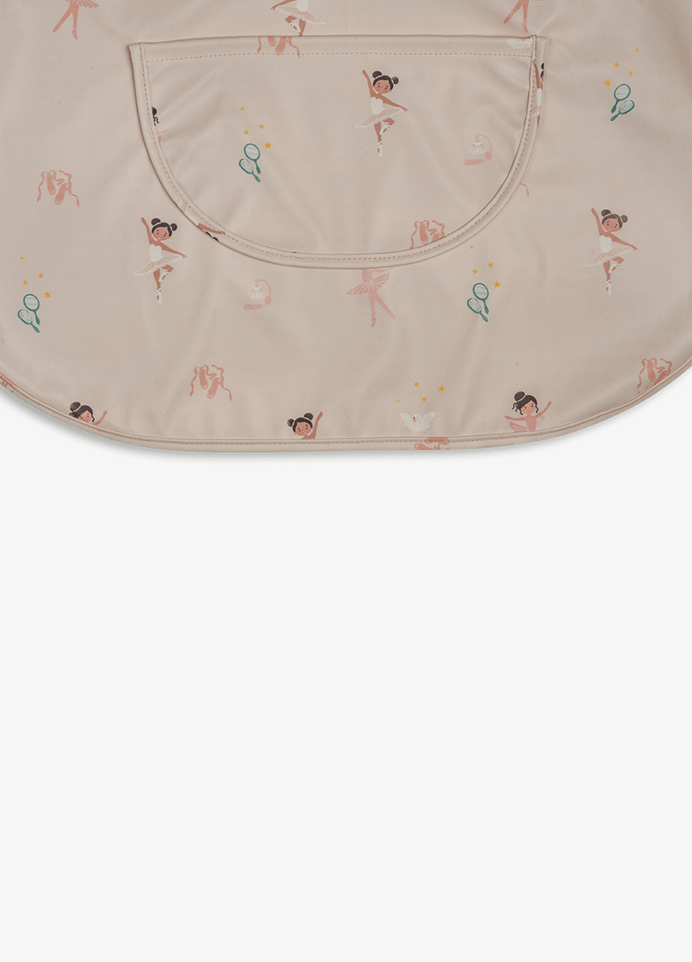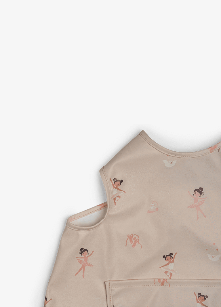 Highlights: -Sleeveless PU feeding bib – Front pocket and closes on the back – Easy to clean – Suitable for 9M+ – BPA free + Available in 2 themes: Vehicles | Ballerina