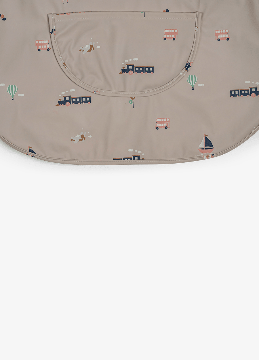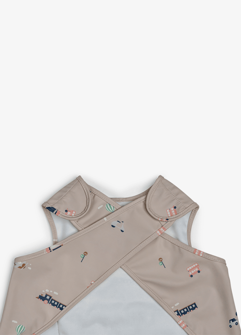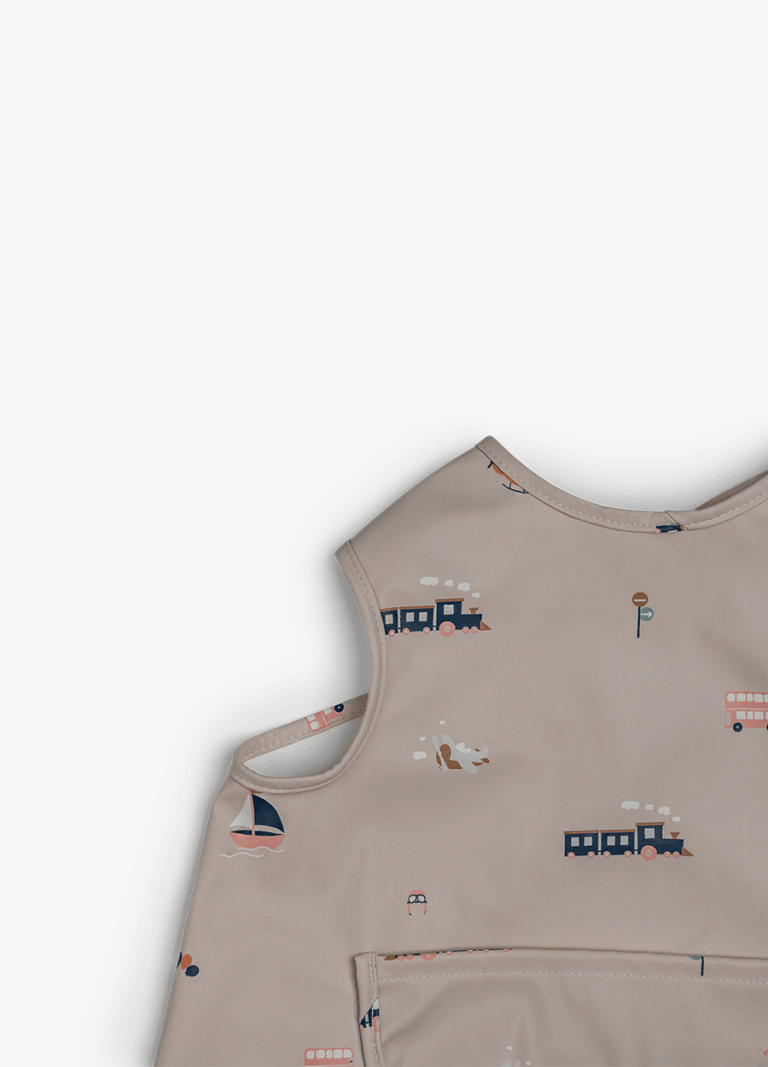Highlights: -Sleeveless PU feeding bib – Front pocket and closes on the back – Easy to clean – Suitable for 9M+ – BPA free + Available in 2 themes: Vehicles | Ballerina