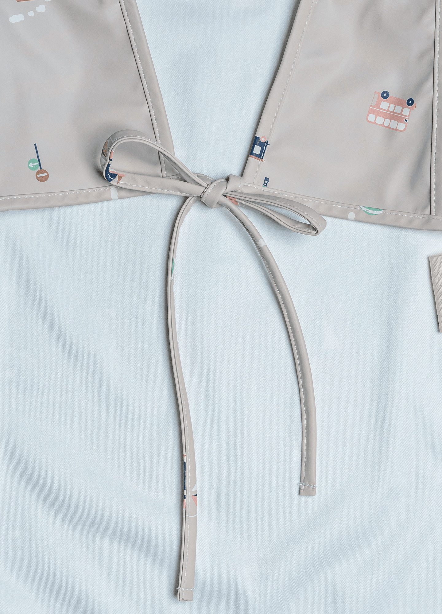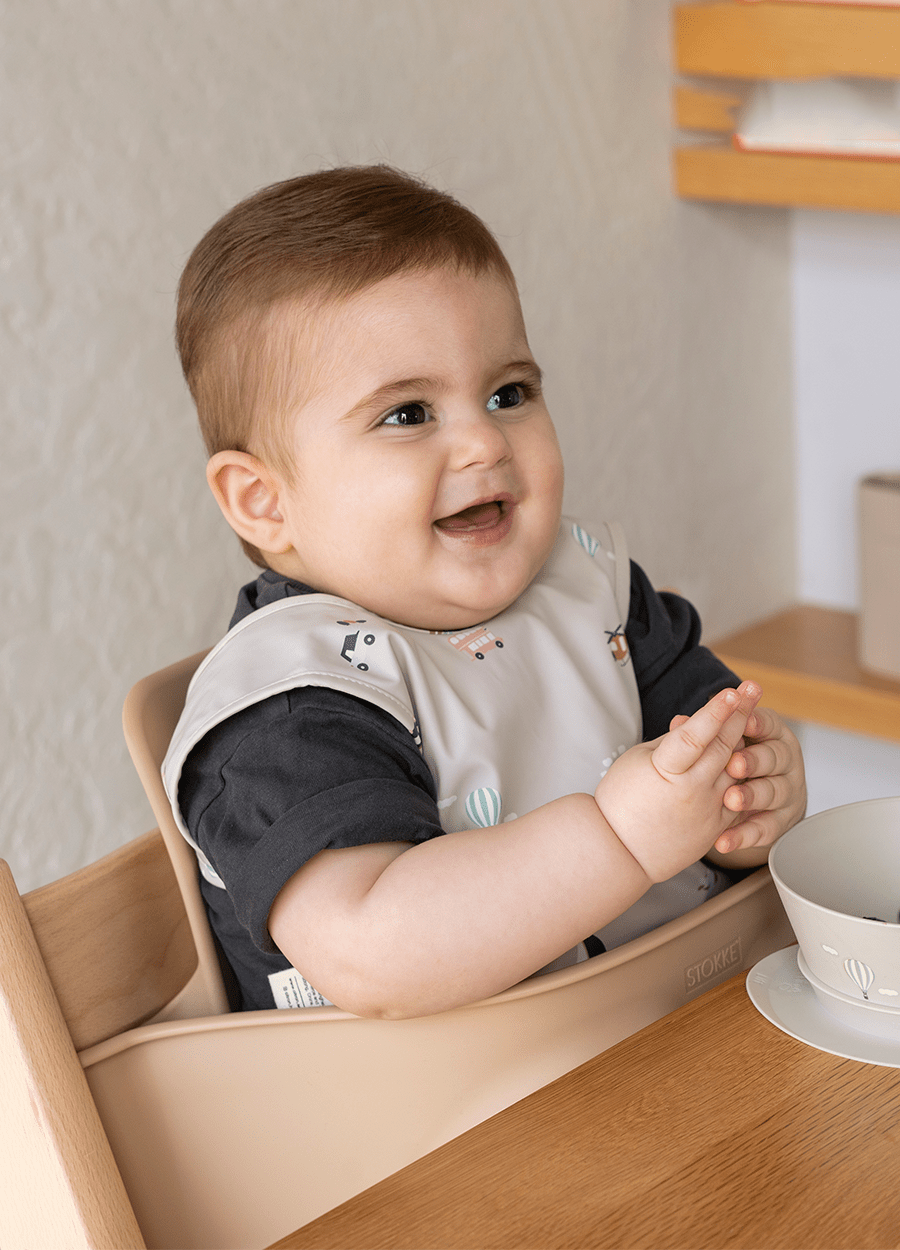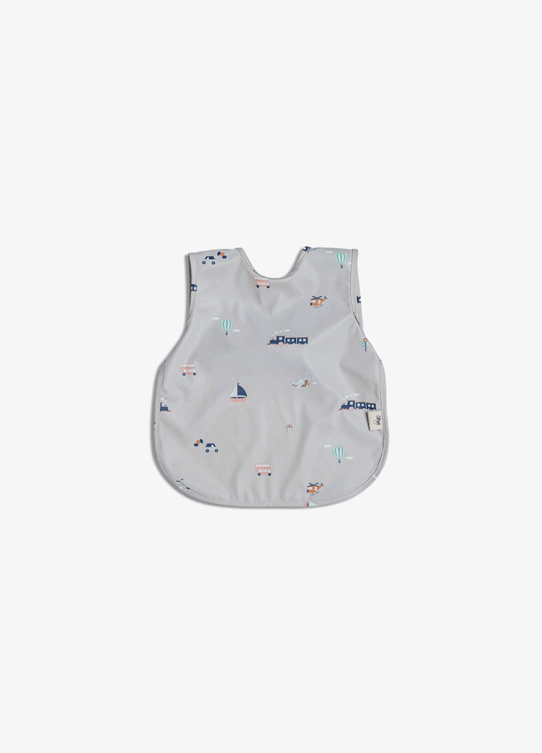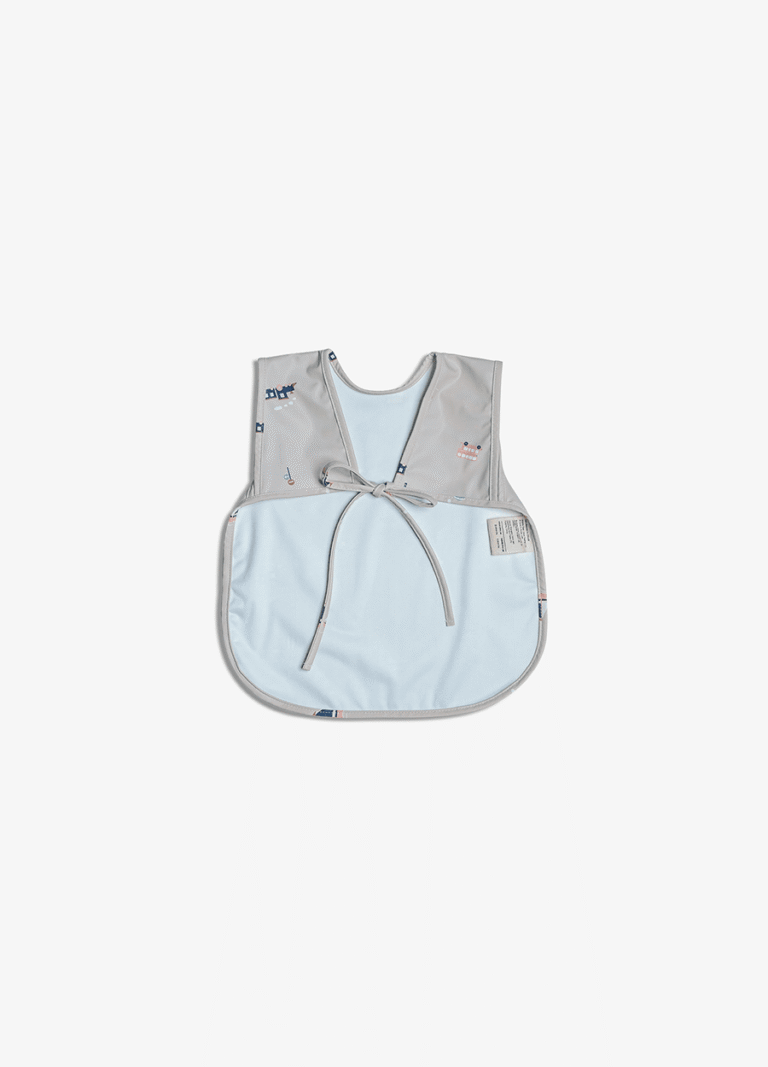 Sleeveless, waterproof bib – Back hook and loop closure – Made from wipeable PU Fabric – BPA free – Dimensions: 30 x 36cm – Age suitability: 6-18 months