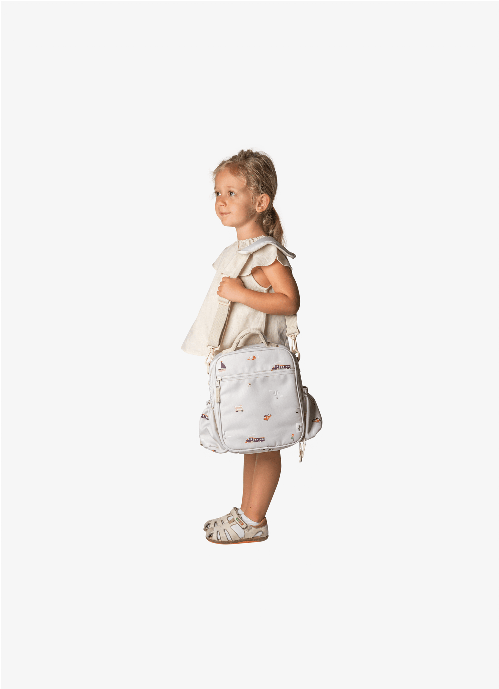 FEATURES + Insulated to keep meals at temperature + Lined with non-toxic thermal material + Includes a label with a name tag inside + Fitted with 2 side pockets for 2 bottles of up to 500ml + Designed with sustainable and non-toxic materials + Has inner and outer zipper compartments for extra storage + Includes detachable padded shoulder strap to wear cross-body + Attached back straps to wear as backpack + Suitable for kids 18+ months + Holds 1 Grand Lunch Box + 1 Absolut Tritan Snack box + 2 water bottles or 1 Tritan Lunch Box + 1 Absolut…