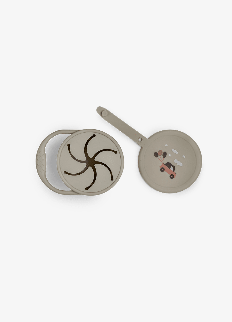 Highlights: – Spill free snack container with petal opening and separate cover -Foldable design for easy storage – No slip handle – Food safe and BPA free -Age: 6M+ -Capacity: 200ml -Weight: 108g -Dimensions: 12.5×9.4×8.9cm Available in 2 themes: Vehicles | Ballerina