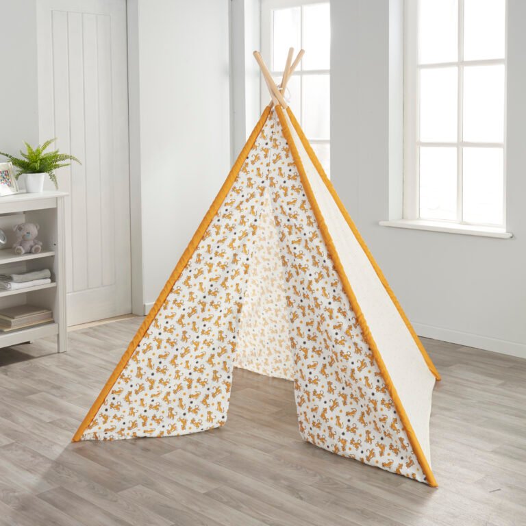 The teepee is made from 100% cotton and has a sturdy design that is supported by four poles.