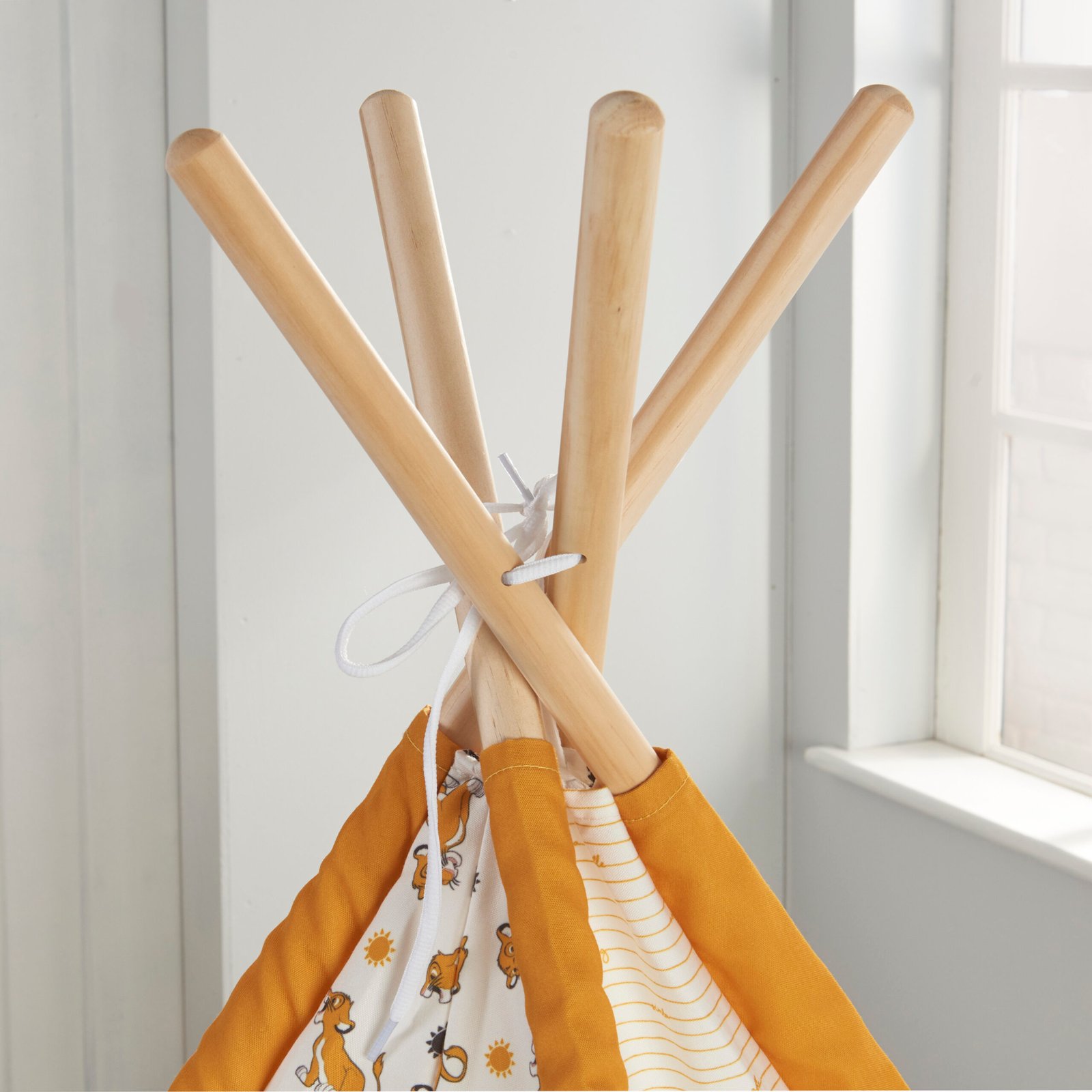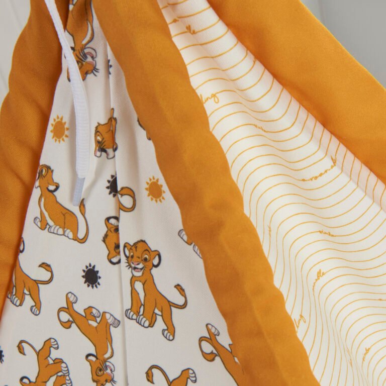 This teepee has a fun, high quality printed Lion King design on each panel of the tent. The entrance of the teepee can be tied together with the two ribbons or can be folder back and tied to keep the doors open.