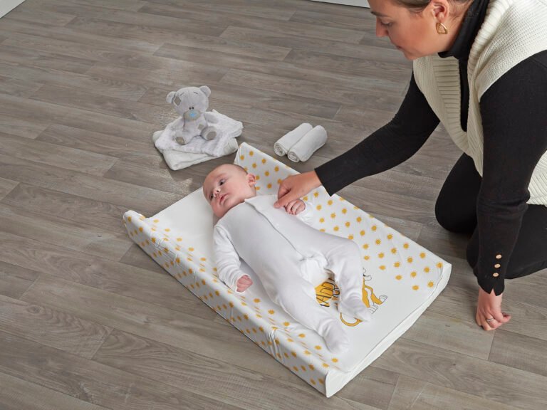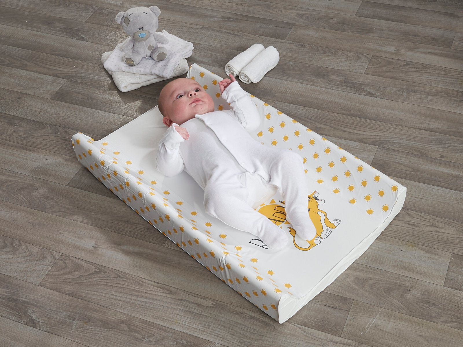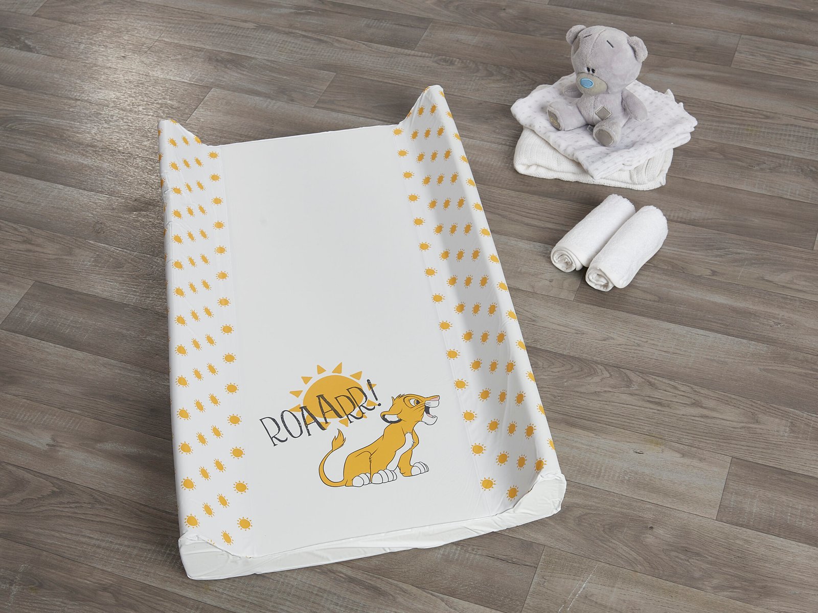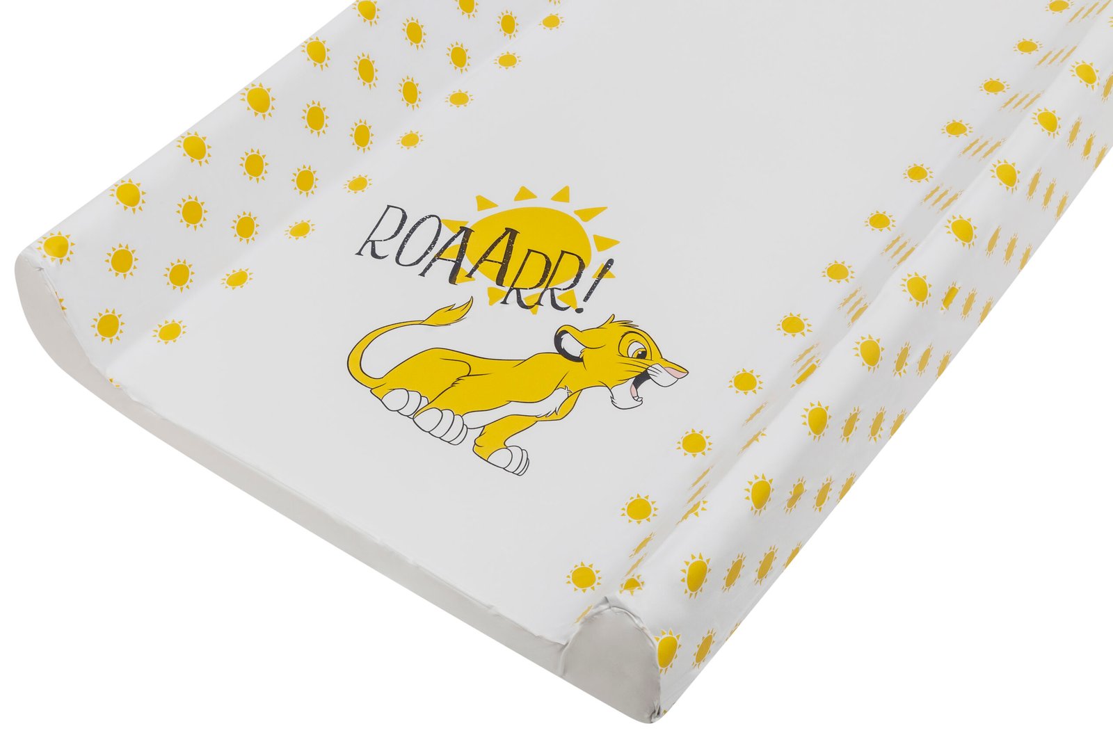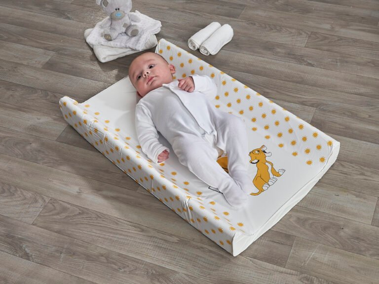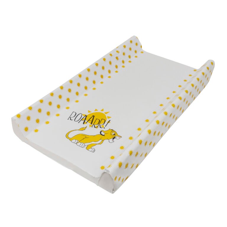 Suitable from new-born, this Lion King Wedge Changing Mat is the perfect aid to help you with changing time and a must for any nursery. The mat has a high quality and vibrant printed design which will help keep your little one entertained. The mat have a polyurethane foam insert, creating a soft and gentle place for your baby to lie whilst also providing sturdy support for their backs. The raised wedge sides on the mat provide added support and will help to reduce wriggling around. , , The edges of the mat have a smooth rounded finish so your little ones delicate skin is protected. The covers are made from phthalate free PVC, making it easy to clean and maintain. Babies must be supervised at all times when using a changing mat, never leave your baby unattended, this product is not designed to be used on an elevated surface. Do not use any abrasive, bleach, sterilising solutions or harsh chemicals. Do not rub vigorously.