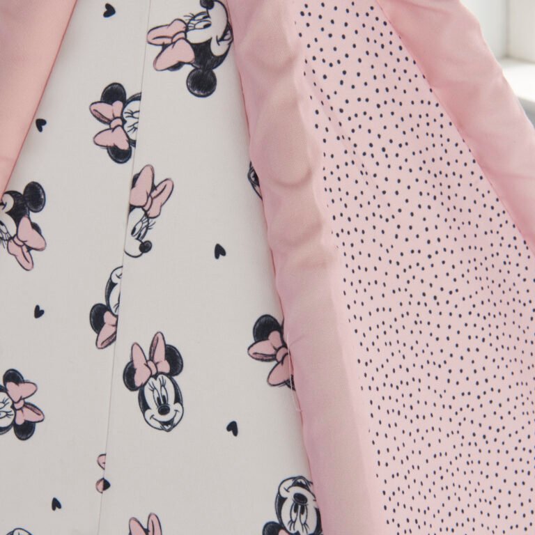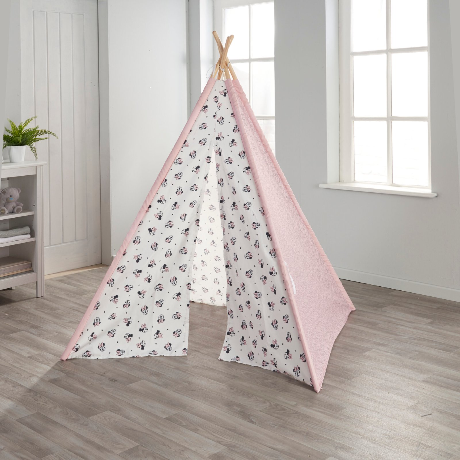 This teepee has a fun, high quality printed Minnie Mouse design on each panel of the tent. The entrance of the teepee can be tied together with the two ribbons or can be folder back and tied to keep the doors open.