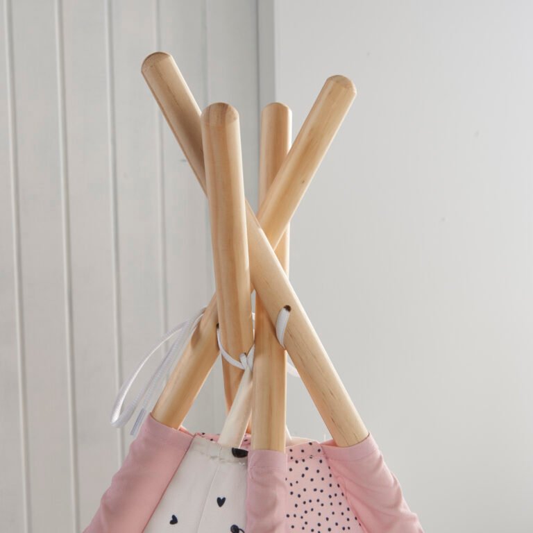The teepee is made from 100% cotton and has a sturdy design that is supported by four poles.
