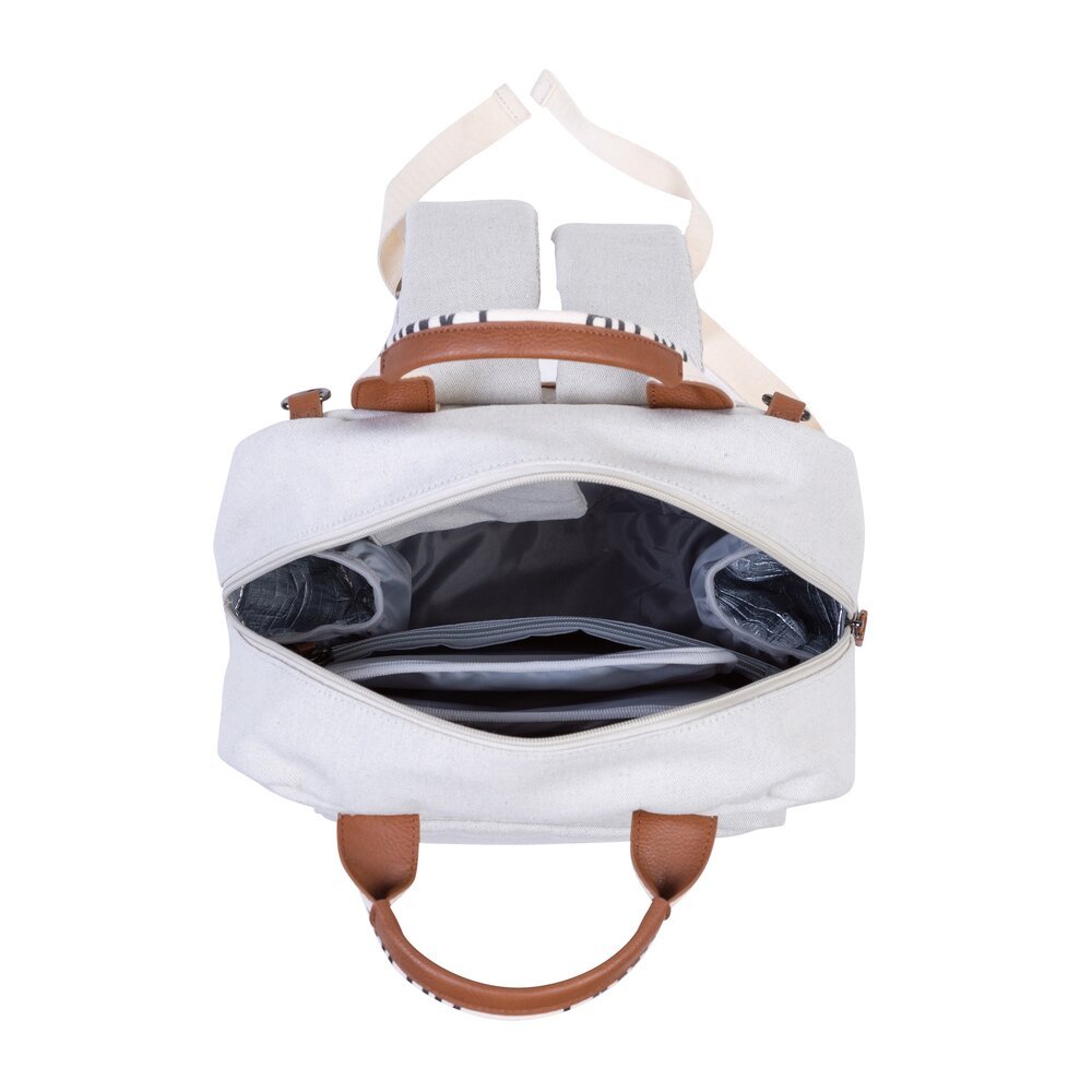 It is equipped with two large compartments and nine smaller ones. A zipper pouch allows you to store dirty clothes when needed. Additional smaller pouches make it possible to safely store your baby’s soother as well as your own wallet and keys. Two cooling pouches will keep your drink and snacks fresh during the day. Should your little one make a mess during lunch, the pouch in front of the bag especially designed for wet wipes will come in extra handy. It is very easy to access so you will never have to search for wet wipes again! And of course, the changing mat is also included.