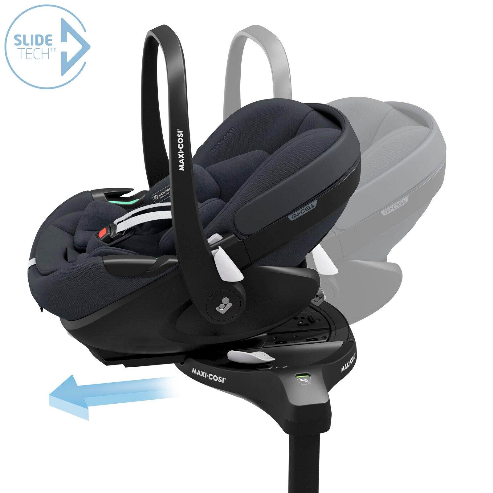Revolutionary sliding car seat technology makes every day easier for parents. No backaches, head bangs or struggles.