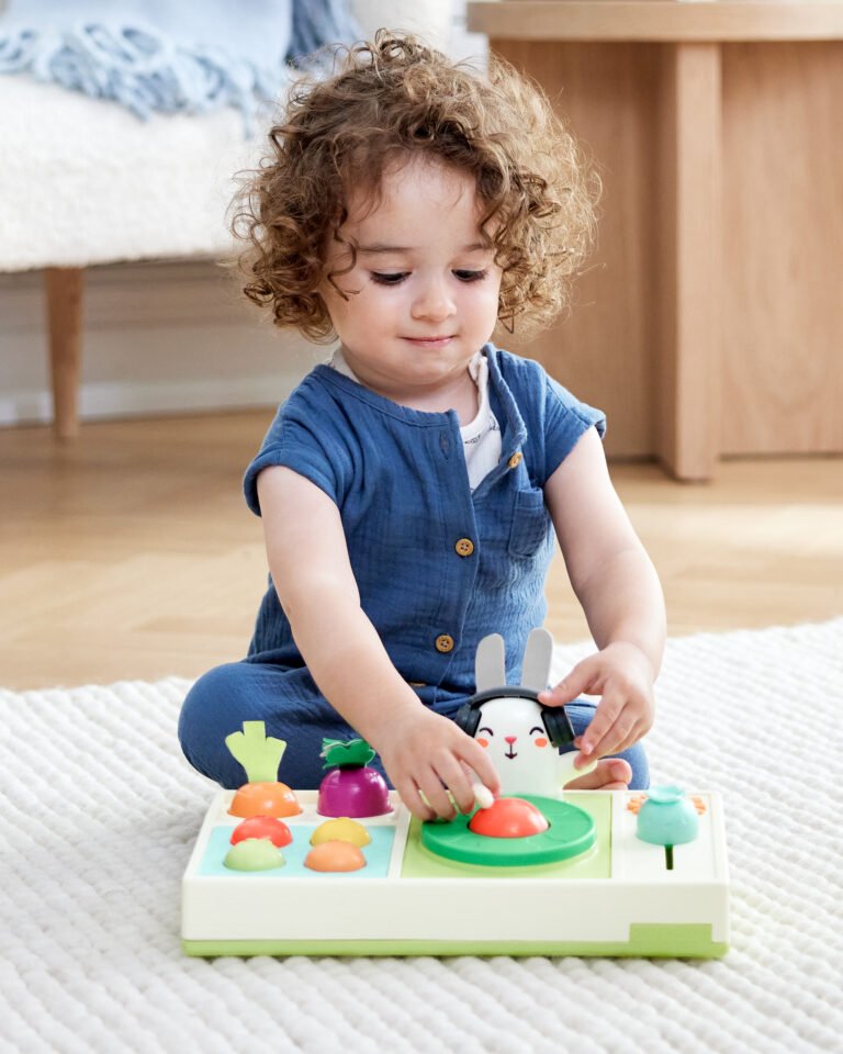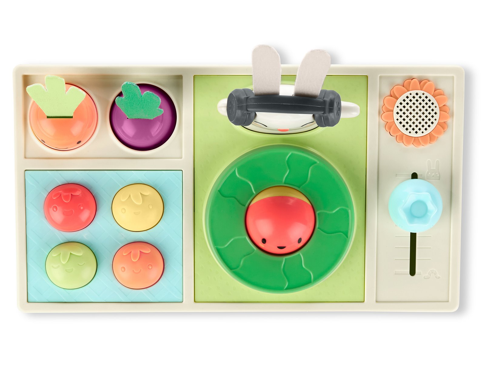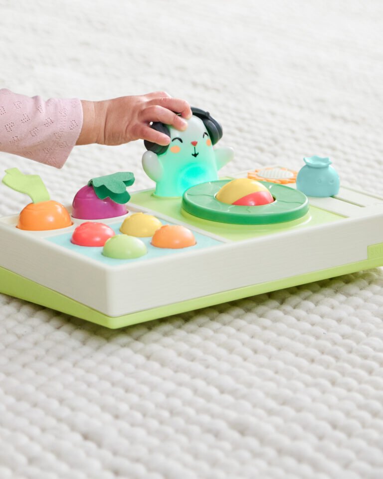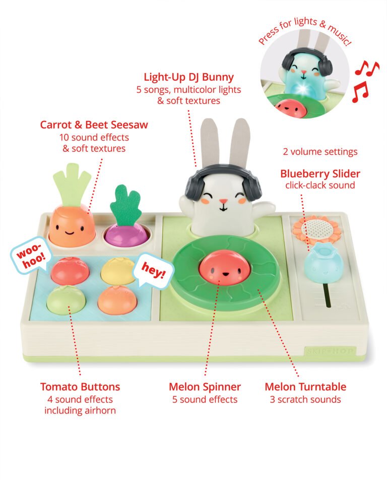Age 6m+,30+ play features, songs & sounds,Light-Up DJ Bunny: 5 songs, multicolor lights & soft textures,Carrot & Beet Seesaw: 10 sound effects & soft textures,Tomato Buttons: 4 fun sound effects including airhorn,Melon Turntable & Spinner: 3 scratch sounds & 5 sounds effects,Blueberry Slider: Click-clack sound,Helps encourage fine motor skills, hand-eye coordination & pretend play,Helps teach cause & effect,2 volume settings,Coordinates with Skip Hop Farmstand Collection,Size (inches): 12.1L x 6.7W x 6.8H; 30.73L x 17W x 17.27H