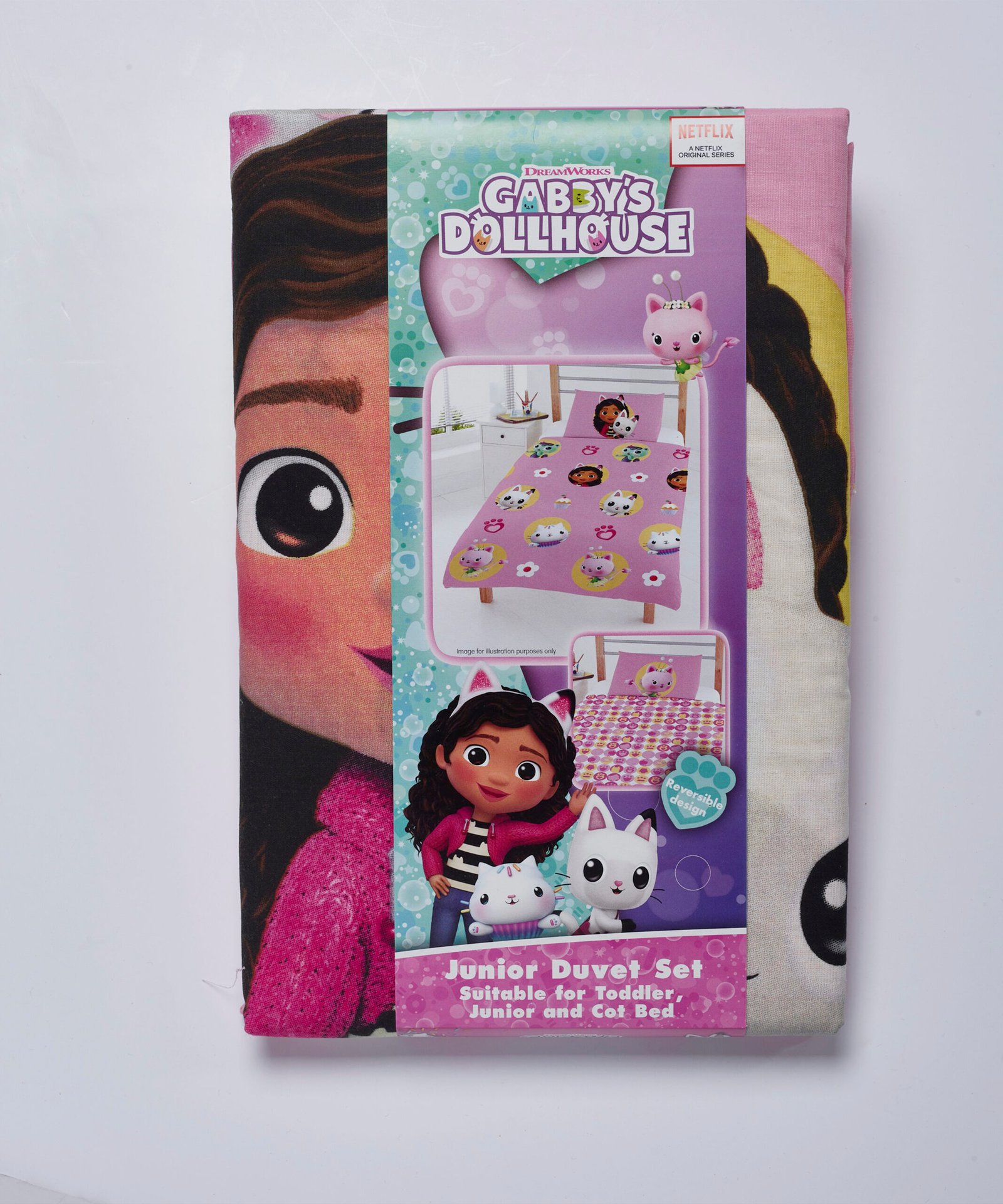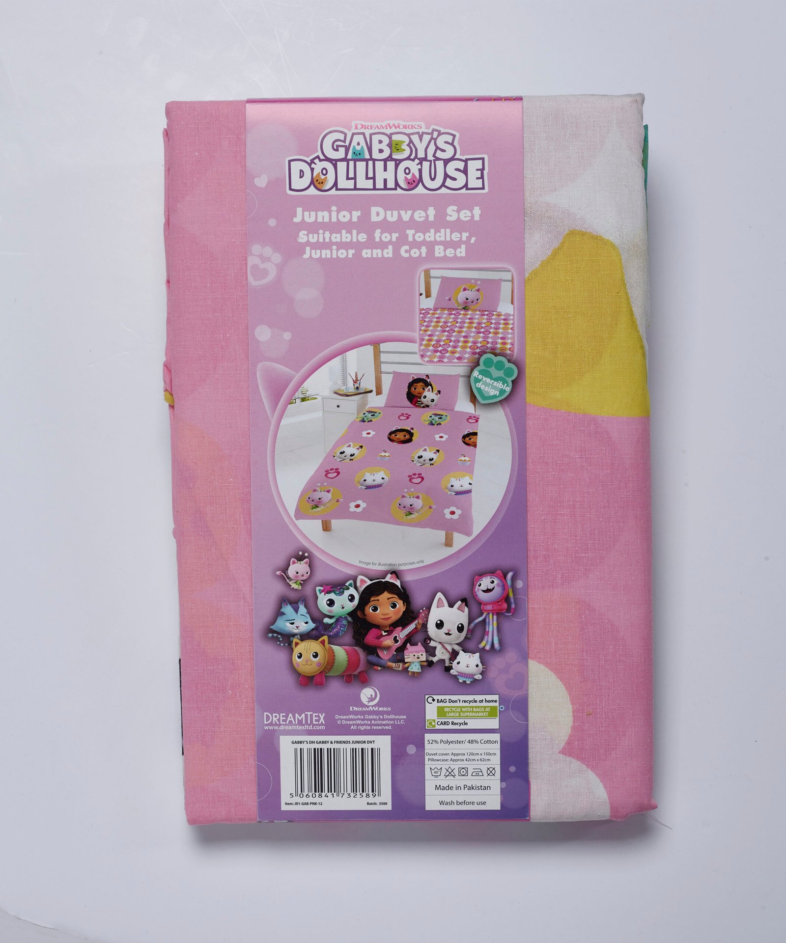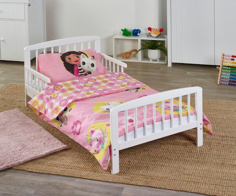 This Gabby’s Dollhouse & Friends bedding set is perfect for any fans of the popular animated series. This design features Gabby, MerCat, CatRat, Pandy Paws, Kitty Fairy, Cakey Cat and DJ Catnip, set on a pink background amongst paw prints, flowers and cupcakes. The reverse features a repeat pattern of pink and yellow circles detailed with kitten paw prints and outlines of Gabby’s friends, set on a white background. This polycotton blend can be machine washed and tumble dried on a cool setting