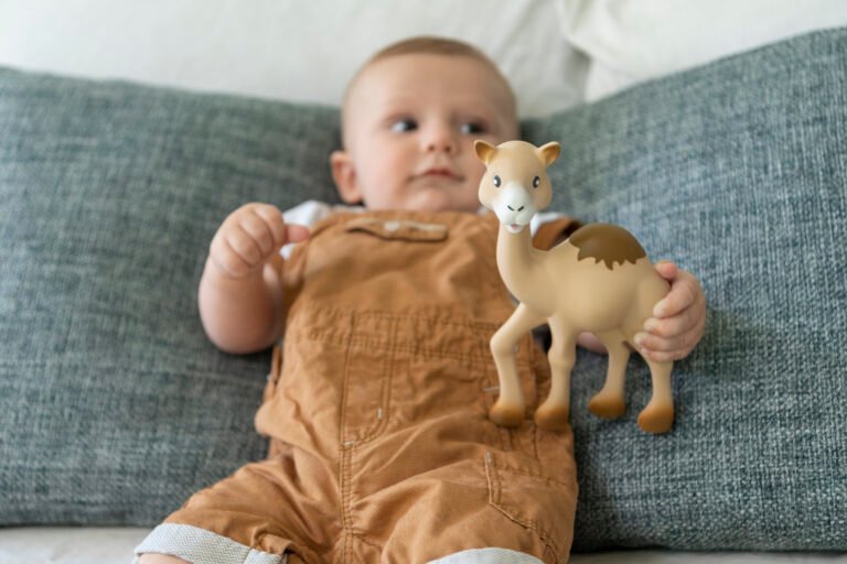 This 18 centimetres dromedary will stimulate Baby’s 5 senses. Made from 100% natural rubber and food grade paint, it soothes Baby by its soft touch and can be chew without moderation to relieve painful gums. His legs and long neck are easy to grab for Baby’s small hands and his whistle will stimulate baby’s hearing.