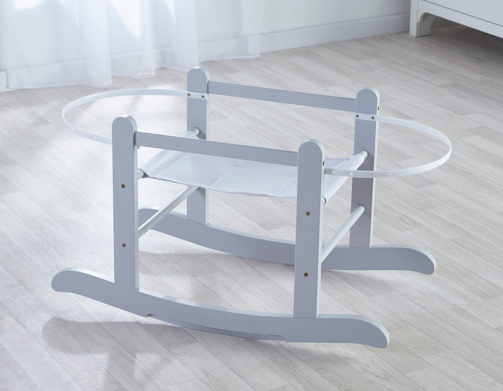 Made from solid pine wood with a White painted finish Smooth rocking motion to soothe your little one Adjustable straps to fit majority of moses baskets Easy assembly All fittings included