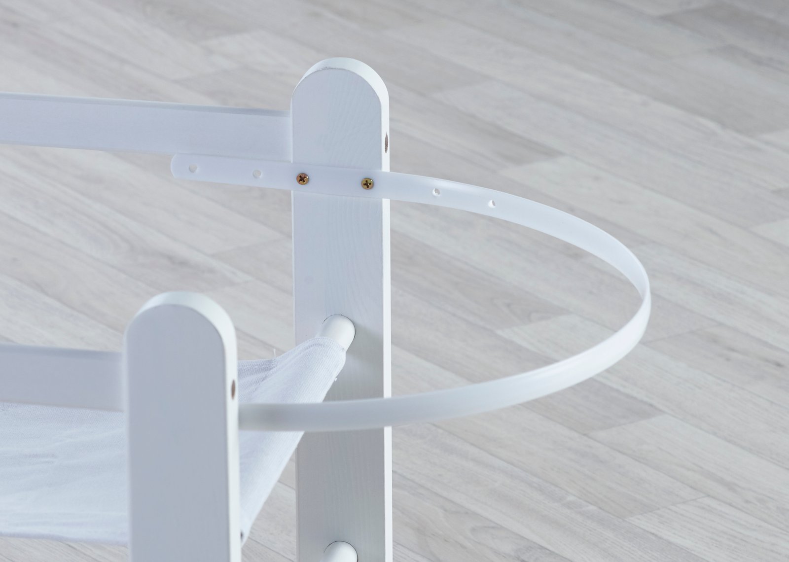 Our Little Gem Rocking stand is a perfect accessory for your moses basket. It is made from solid pine wood with a White painted finish, has a curved base which ensures a smooth rocking motion which will soothe your baby to sleep and adjustable straps to fit any basket size. Easy assembly, comes with step by step instructions and all fittings are included.