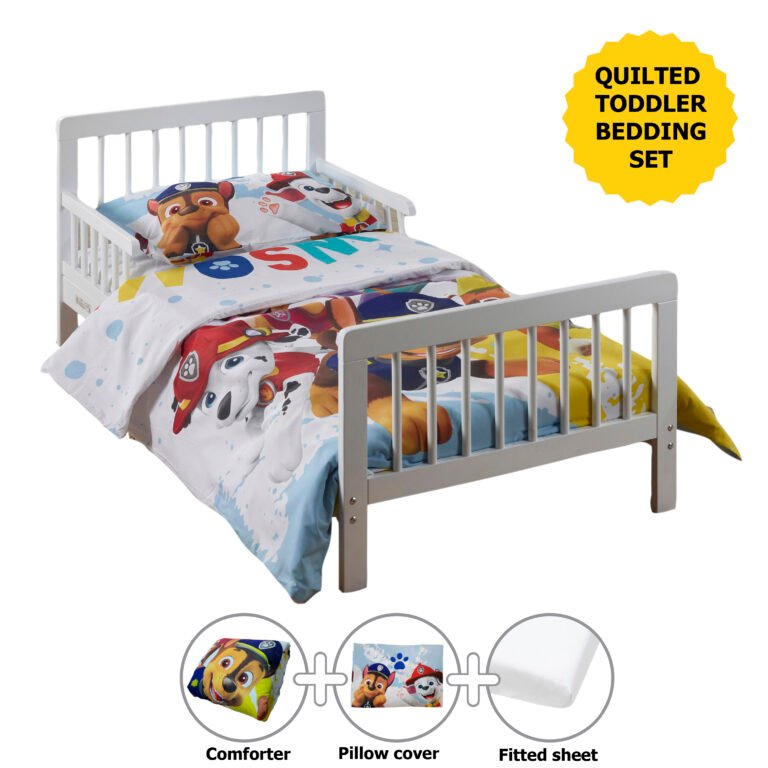 Paw Patrol-themed design. Made from easy-care polycotton this bedding set is machine wash.sets includes 1 x pillowcase 1x quilted Duvet and 1x Fitted Sheet. Suitable to use With Kinder Valley Toddler Bed and CotBed. Suitable to from 18 months up to 9 years old.