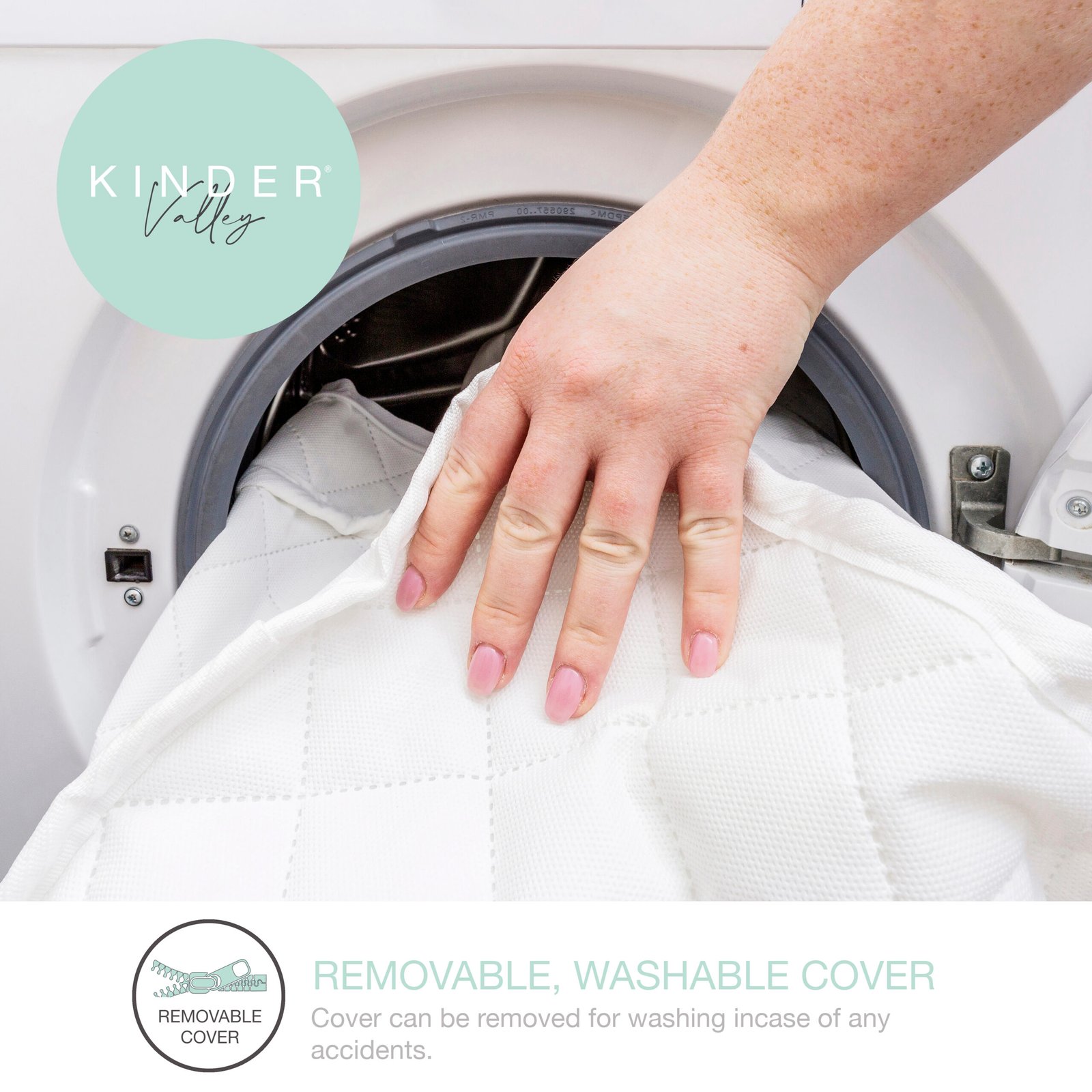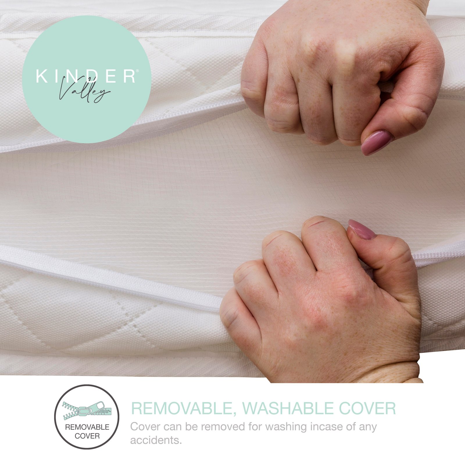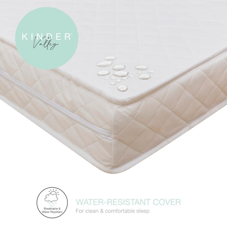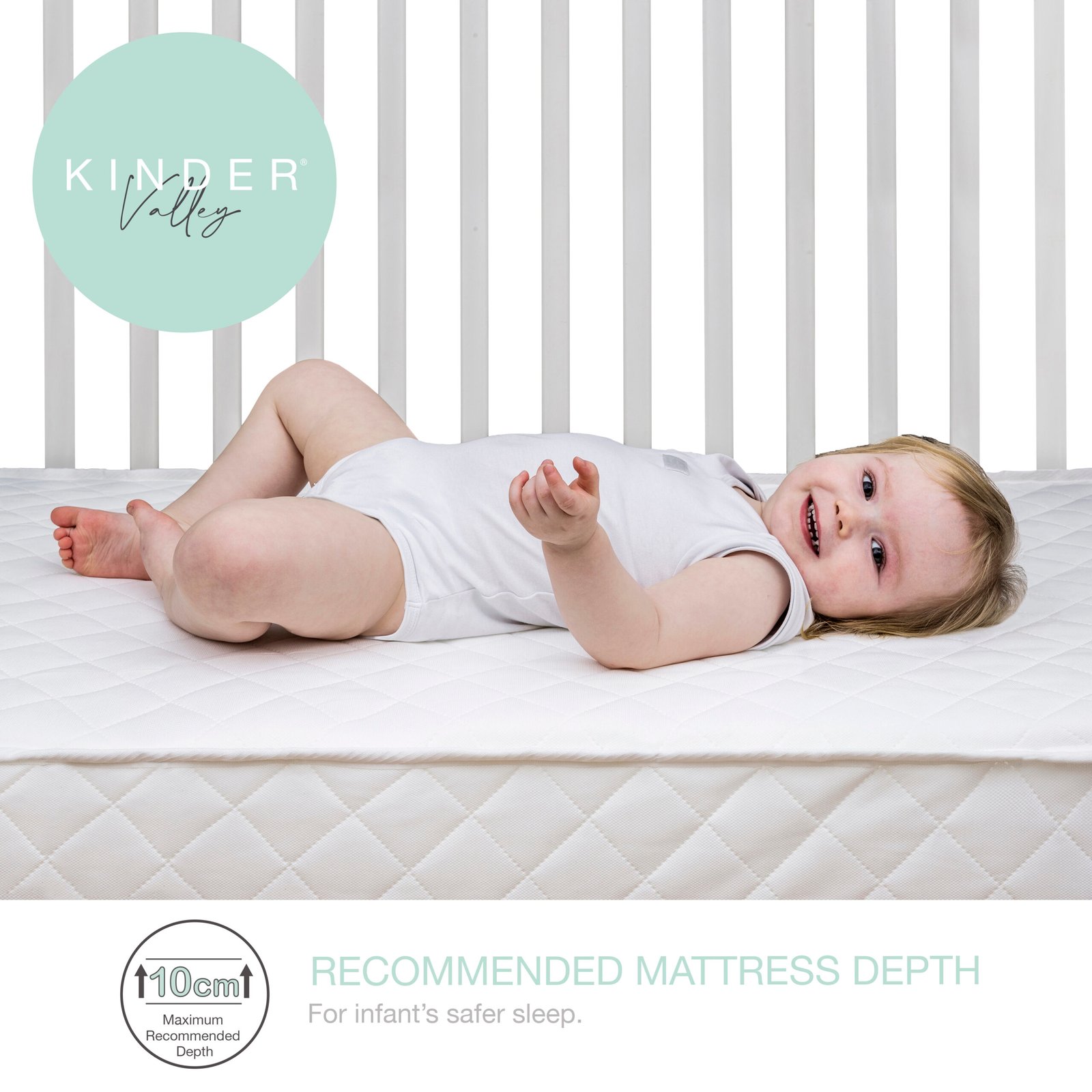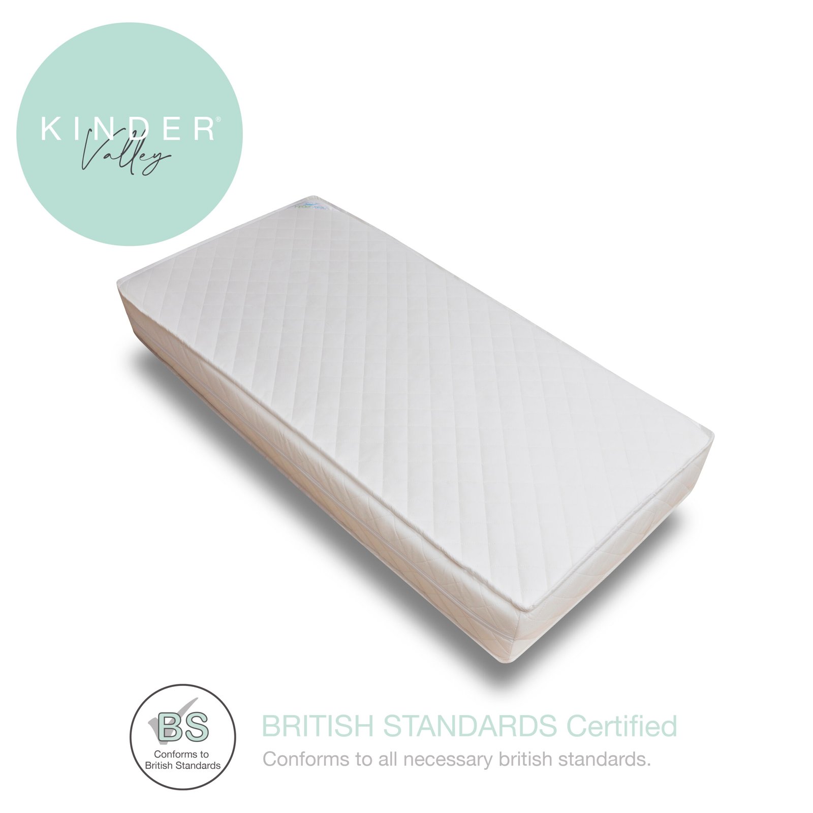 The fantastic Kinder Valley Deluxe Pocket Sprung Cot Mattress contains a Bonnell Spring Unit encapsulated in superior poly fibre interior; providing extra support for your baby. Each spring is wrapped in an individual pocket to allow extra movement and comfort. The mattress cover is double sided and made from luxury CoolPlus® fabric which is air permeable, water resistant, and wipe clean.