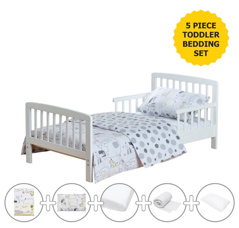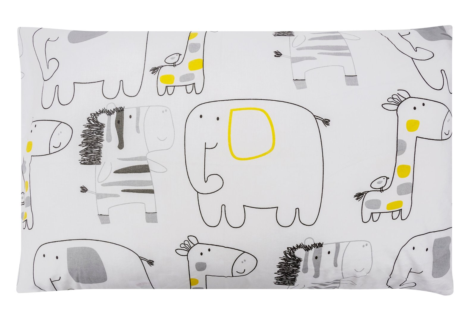 Includes x1 Safari themed pillowcase, x1 woodland themed duvet cover, x1 white fitted sheet 1x toddler pillow 1x duvet