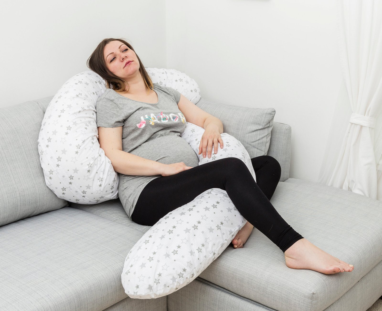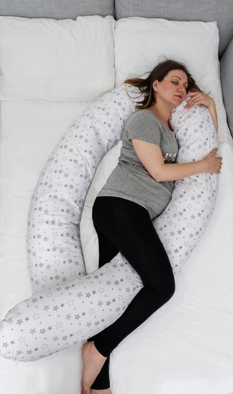 Our versatile full body support pillow is 12 foot in length and can help to support you whilst pregnant and after. It can be used in various positions to help take away those aches and pains, can be used to help support bump, back and knees and aid you to get into that comfortable position. It can also be rolled up and used as a feeding aid when your baby arrives, and also as a sitting aid/for tummy time when your baby grows. It comes with a plain white cover, which can be removed and machine washed.