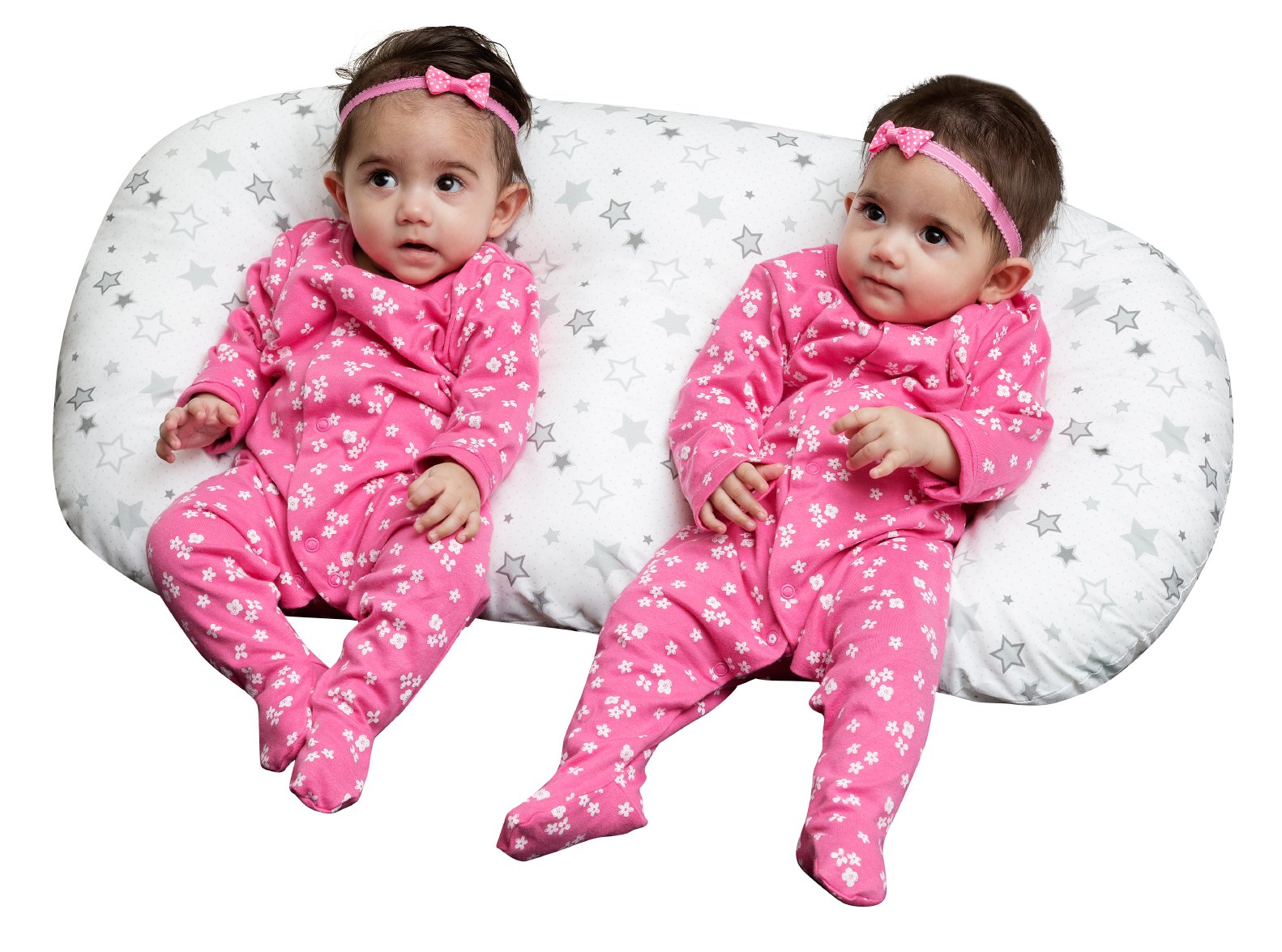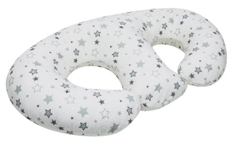 Our Twin nursing pillow is shaped to allow your twins to position themselves comfortably for feeding and take away strain and pressure from you. It can also be used as a sitting aid, and for tummy time as your little ones grow. This multi-use twin support pillow is a great buy, it comes with a silver star design cover, which can be removed and machine washed.