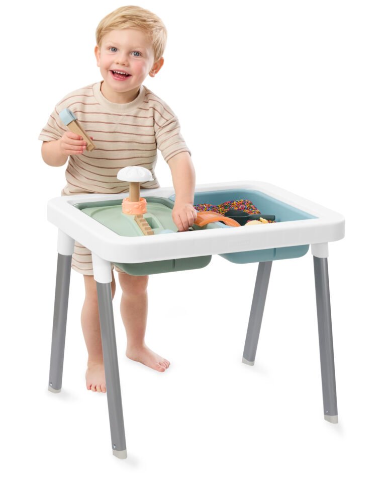 Age 18m+,Developed in collaboration with a sensory play expert,3 modes of sensory play: Floor Play (18m+), Table Play (24m+) & Play Table (36m+),30+ developmental activities,Encourages sensory development, hand-eye coordination, cause & effect, motor skills & pretend play,Table with removable legs, 2 bins, 2 convertible lids, play track,13 nature-inspired sensory tools,8-page activity guide,Fillers not included,Coordinates with Skip Hop Discoverosity Collection,Size (inches): 22.9 x 18 x 22.5; (cm): 58.1 x 45.7 x 57.2