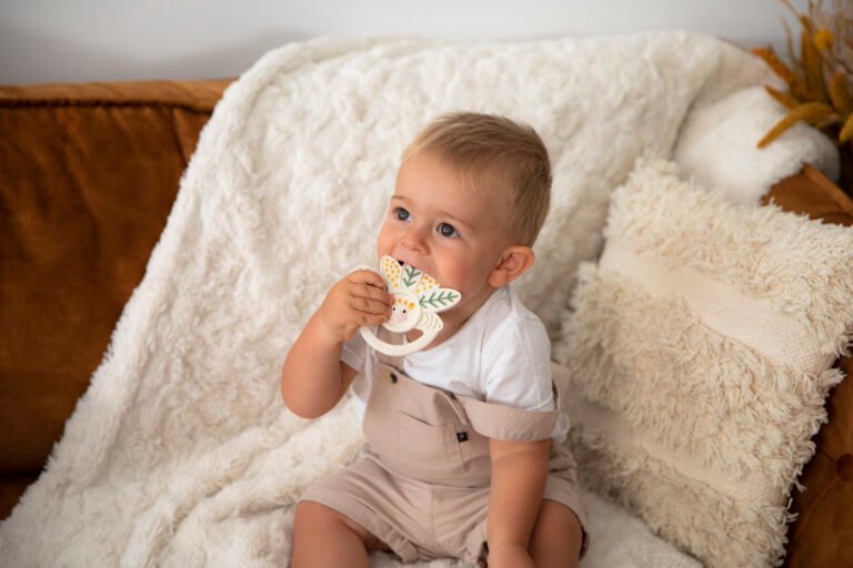 A 100% natural rubber teething ring with multiple textures to relieve baby’s teething!