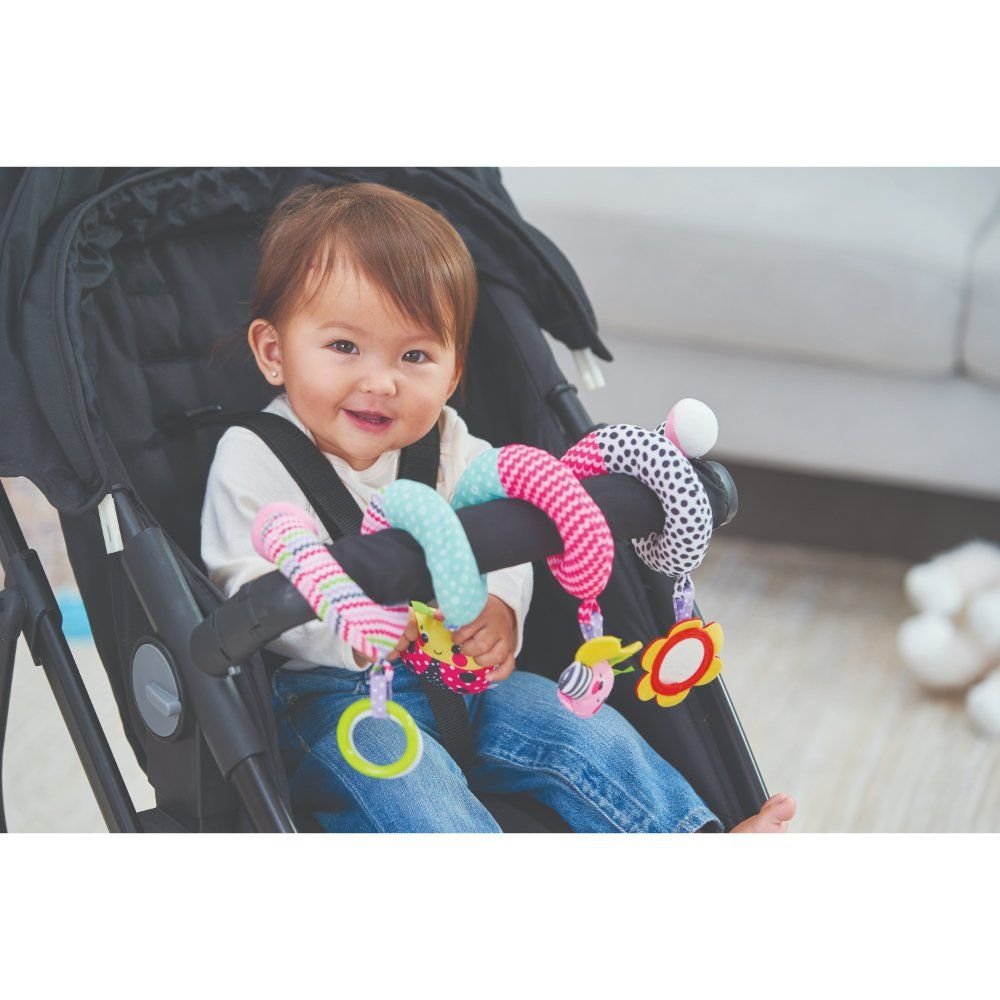 This car seat toy features a plush fabric spiral design that easily wraps around the handle of any car seat or even the safety seat bar of a stroller. It has four different shapes with various textures that dangle from it, making it the perfect for catching baby’s eyes and imagination while they’re travelling. The patchwork fabrics, soft textures, and engaging toys keep little one smiling, even on the go.