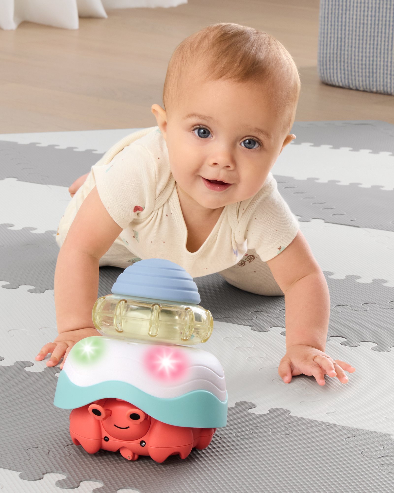 Stacking Fun: Brightly colored stacking rings that encourage fine motor skills as little ones learn to stack them in different configurations.,,Crawling Companion: The crab can move or roll, encouraging babies to crawl after it, promoting physical activity and coordination.,,Interactive Features: It may include lights, sounds, or music to engage your child and enhance sensory play.,,4-in-1 Versatility: The toy can transform through different stages of play, adapting to your child’s developmental needs.