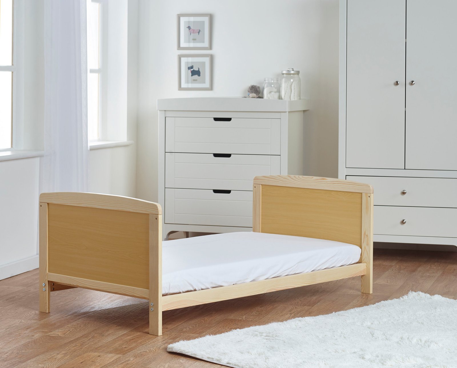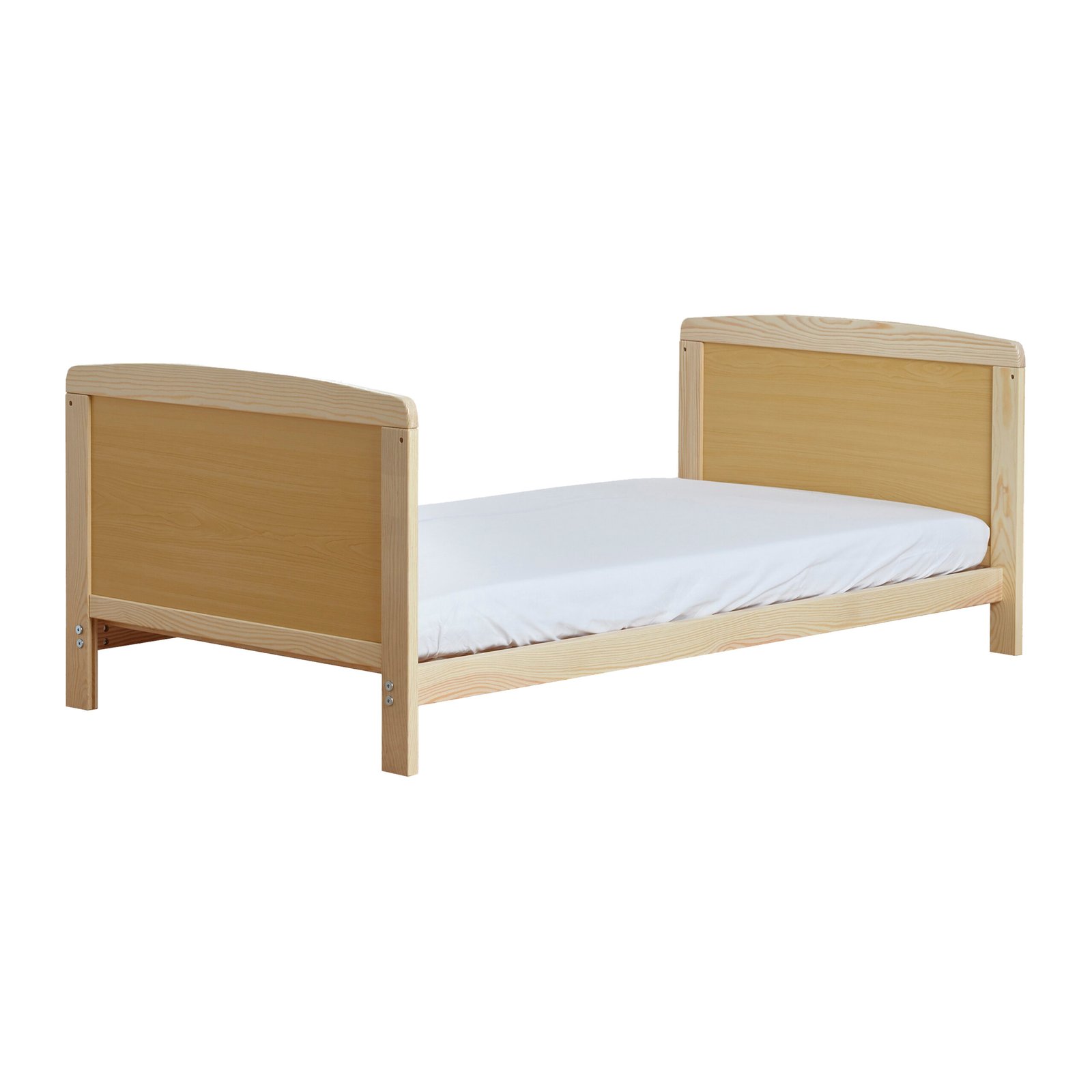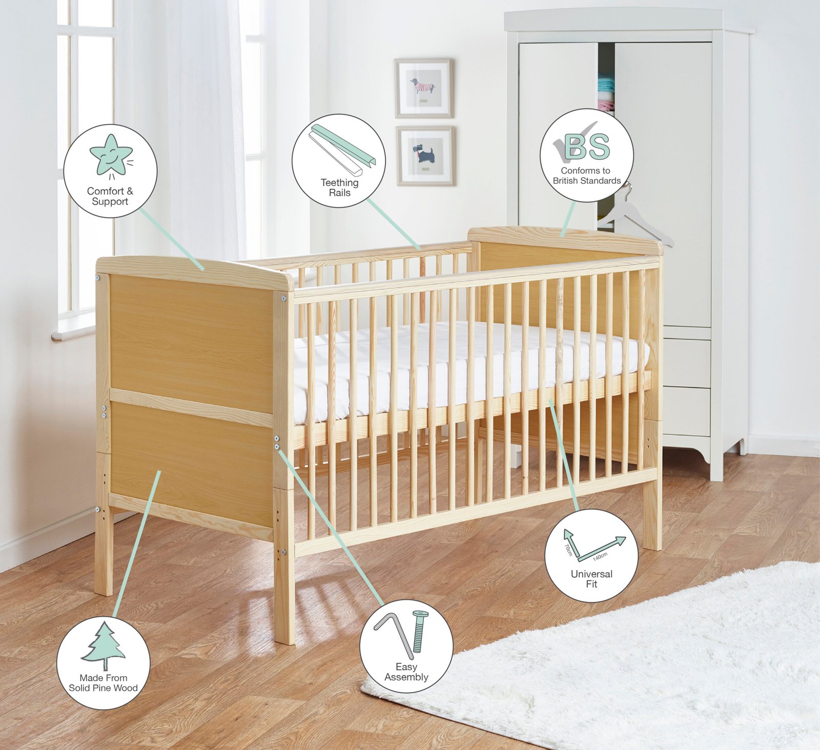 This 2-in-1 Sydney Cot Bed is crafted from solid pine wood and has a stylish natural finish. It has a contemporary New England style headboard with smooth slimline dowels, sleek side rails and the option of three base height positions. For added protection, teething rails are attached to protect infant’s teeth and gums.