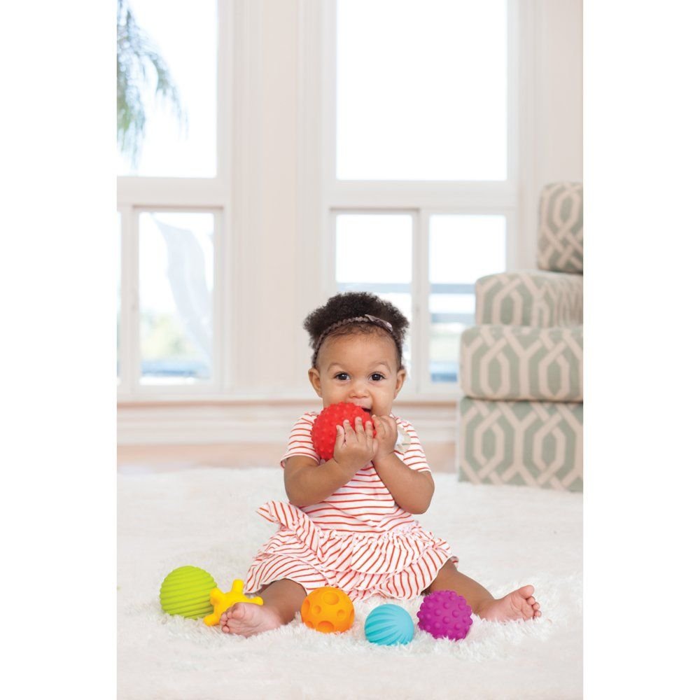 Bright colors and interesting textures make this fun ball set an imagination sensation! Touch and feel six uniquely textured balls in different shapes and sizes. Perfect for sensory exploration and tactile development.