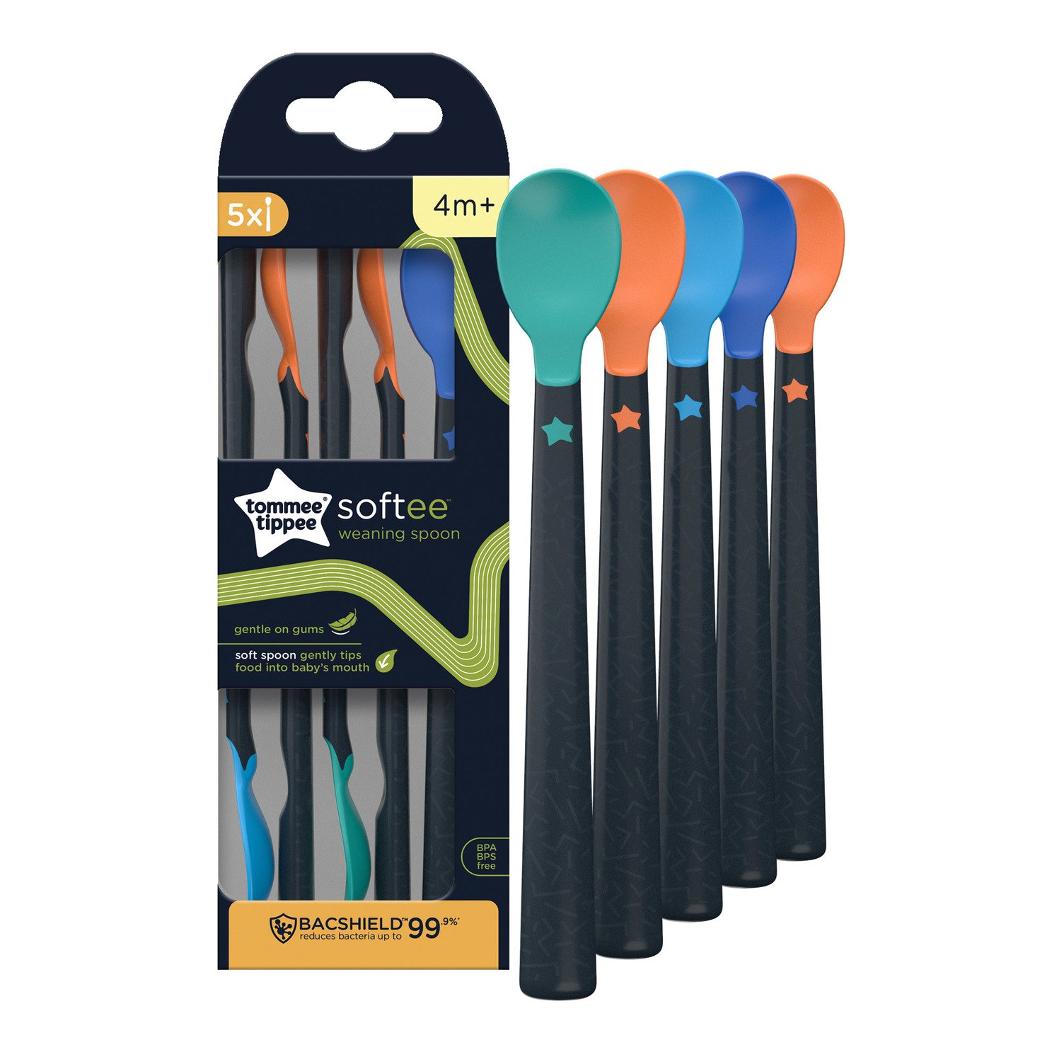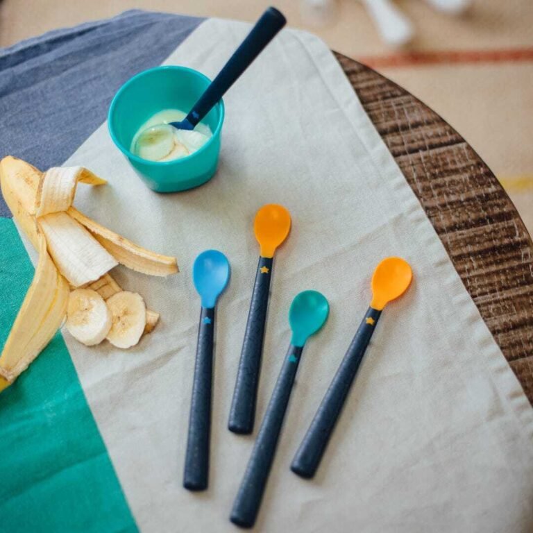 This learning to eat spoon with its intelligent design makes learning to eat a breeze. Thanks to the particularly soft tip, the food gets gently into your baby’s mouth. When babies start to eat themselves, they only peel the porridge off the spoon. If the spoon is hard and inflexible, not much porridge reach the mouth. That’s why all of our learning to eat spoons are so soft that food gently gets into your baby’s mouth when they touch the spoon recess with their tongue. A full baby is a happy baby – and satisfied babies have satisfied parents. If you feed your baby from a jar or other container, this is a muddy matter when the spoon handle is too short. That’s why all our learning to eat spoons have long stems, so you can easily spoon the porridge from the jar. You can also place the non-slip spoon handle on the edge of the bowl without the spoon slipping into the food. Hygiene has never been as important as today. With our spoons, you can confidently hook off this important point, because the elevation ensures that the porridge does not come into contact with surfaces (and possible germs). The spoons also contain the bacteria-inhibiting Bacshield, so that your baby is protected from germs while eating. Suitable for babies from four months In addition, all our products are free from BPA, BPS, PVC and nitrosamines.