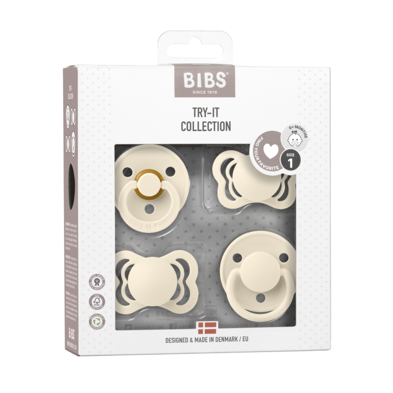 Understanding this, BIBS has developed the Try-it Collection, a thoughtful selection designed to make the process of finding the ideal pacifier simpler and more enjoyable. With the Try-it Collection, parents receive a curated set of four different pacifiers, each with a distinct nipple shape and material, allowing parents to test a variety of styles. This collection includes both round and orthodontic shapes in natural rubber latex and silicone, giving babies the chance to experience different textures and designs. The BIBS Try-it Collection is the perfect way for parents and babies to embark on the journey of finding that “perfect match” pacifier, one that offers comfort, quality, and familiarity, all while making parenthood just a bit easier.