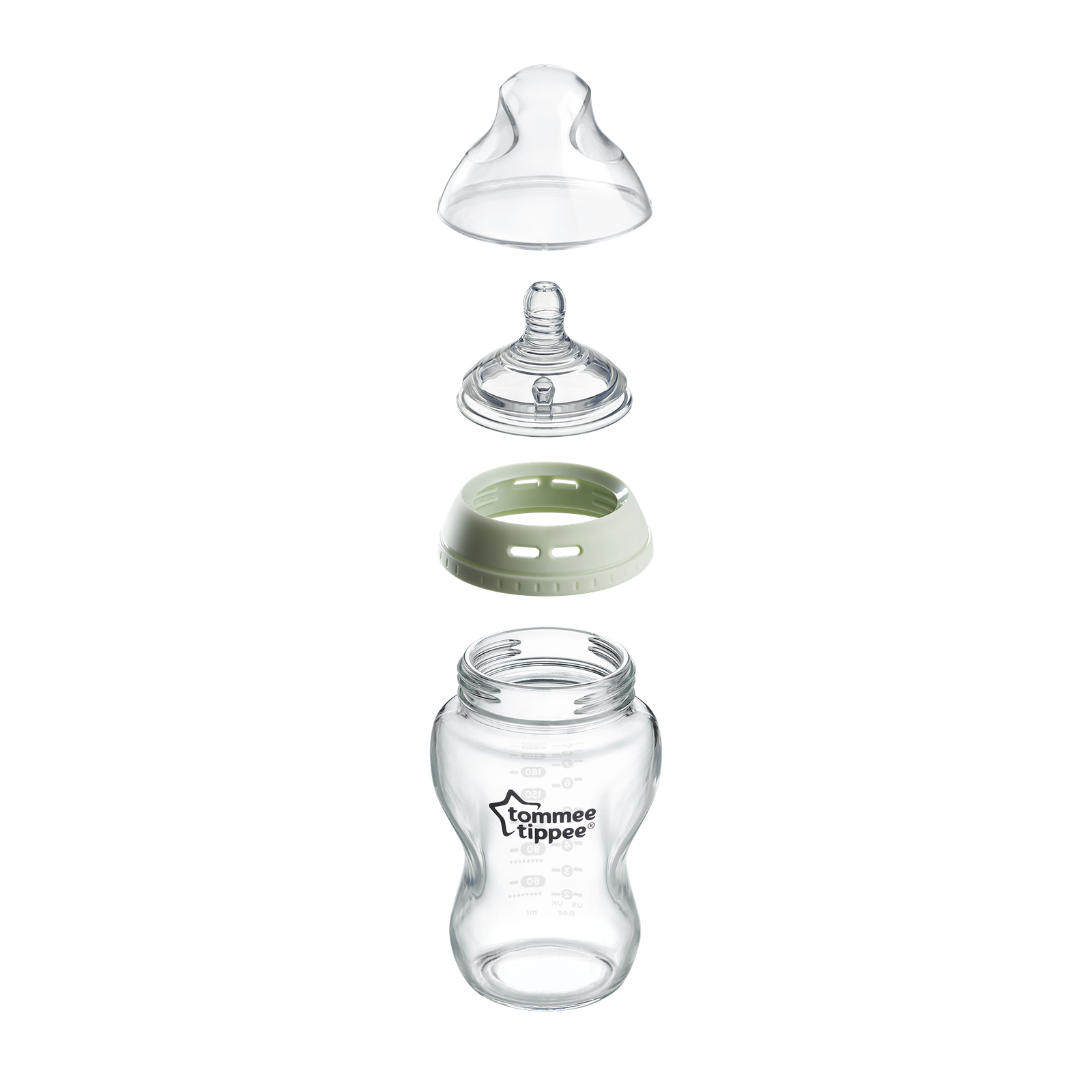 Naturally sustainable. Made from medical grade glass that’s long-lasting and won’t stain. Soft, silicone teat, that flexes and stretches like a breast Anti-colic valve, to keep gas away from baby’s tummy Speedy self-sterilising, in just three minutes in the microwave* 100% leakproof with the lid (even when upside down) It’s also BPA free *Based on placing one bottle in microwaves from 700-1000w