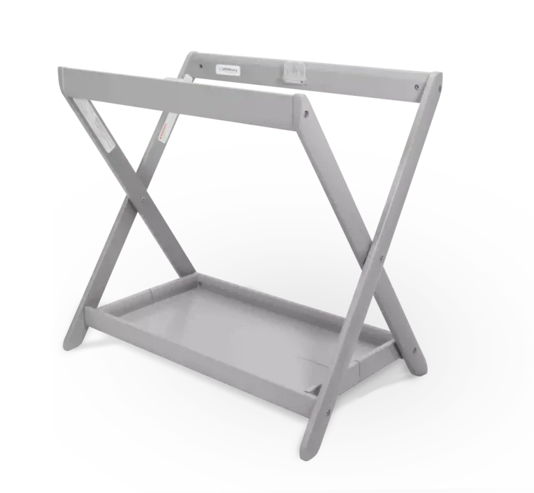 Secure elevated fixture for bassinet that keeps baby up and off the floor Bassinet directly attaches and clicks into stand One-step open and close Extended use as a hamper with the addition of the Bassinet Stand Hamper Insert accessory Convenient tray on bottom Narrow, compact fold for storage Available in grey, espresso and white Does not fit Bassinets 2014 – earlier