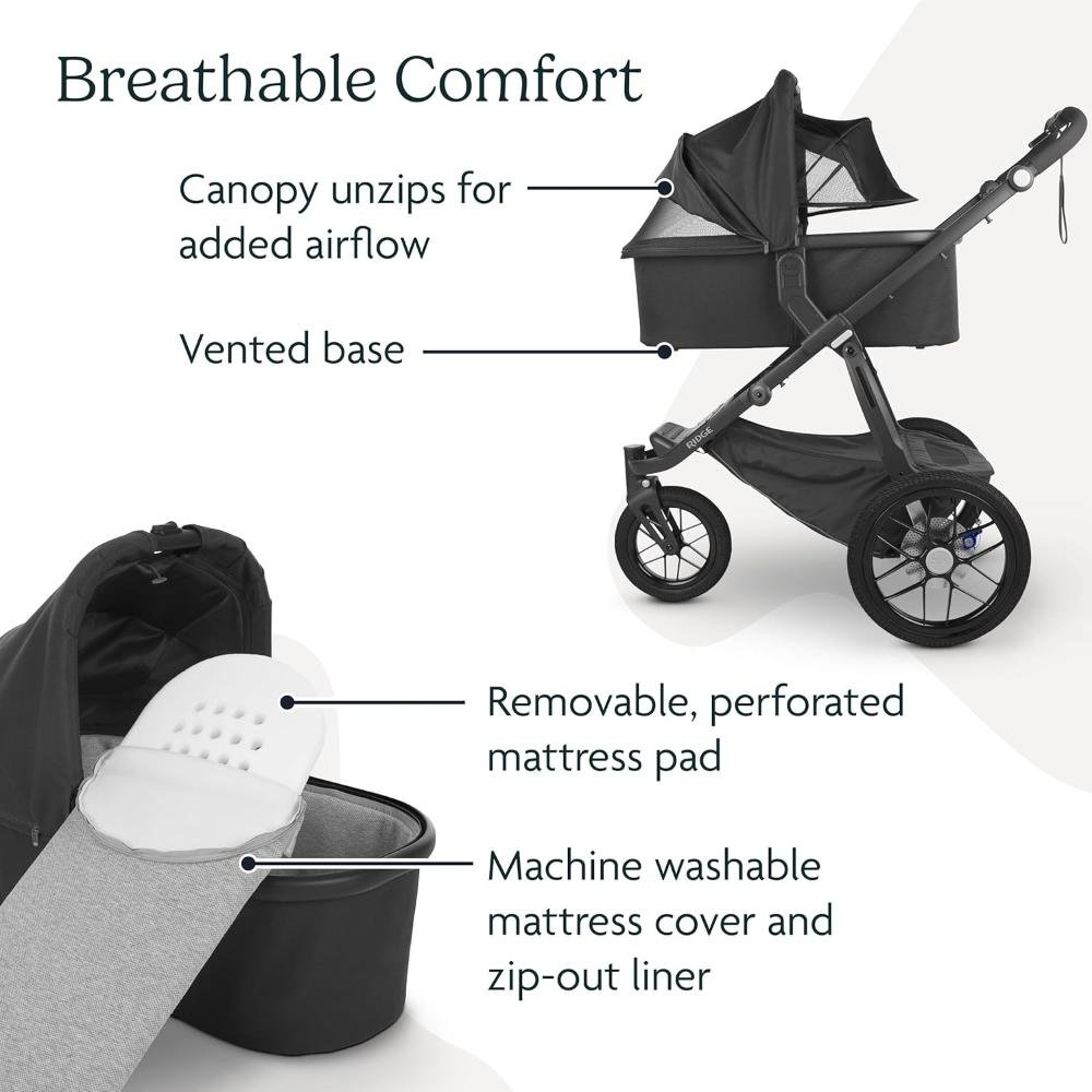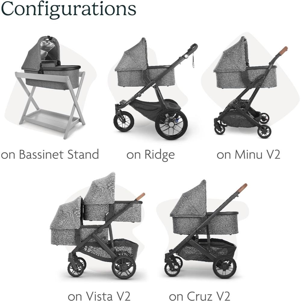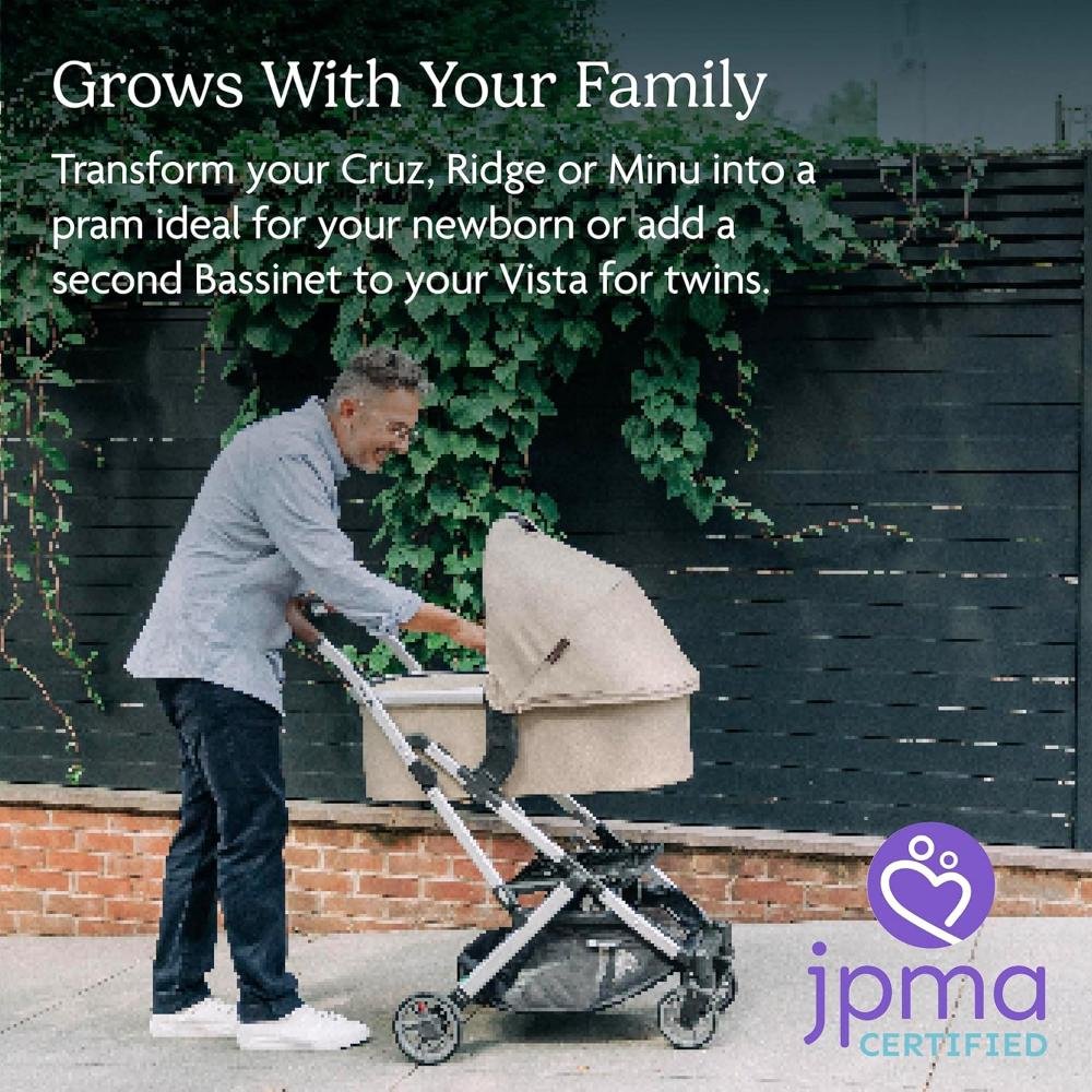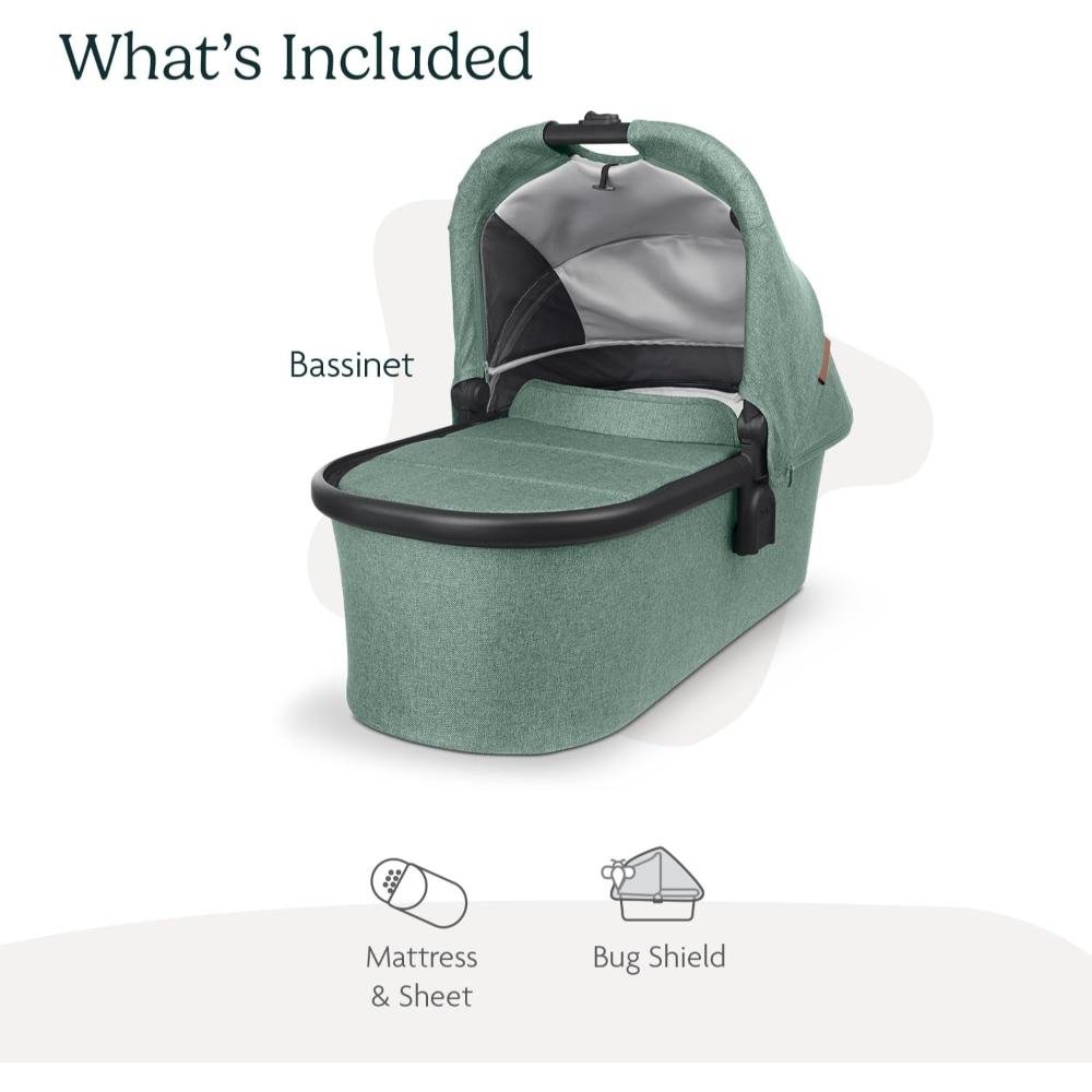 The UPPAbaby Bassinet offers a safe, stylish, and comfortable solution for newborns, whether for strolls or overnight sleeping. Designed with enhanced breathability, it features cross-ventilation panels that can be opened for greater airflow or closed for added warmth, a vented base, and a foam-free air mesh baby mattress to ensure a safe sleep environment. The extendable UPF 50+ sunshade provides superior sun protection, while the unzippable canopy allows for additional airflow. The dual-zipper bassinet boot cover offers easy access to tend to your baby, and the zip-out, water-repellent inner liner and machine-washable mattress cover make cleaning simple. Built for convenience, the collapsible design of the bassinet allows for easy storage when space is limited or while traveling. Secure attachment indicators ensure the bassinet locks safely onto compatible UPPAbaby Vista (2015 models and later), Vista V2, Vista V3, Cruz (2015 models and later), Cruz V2, and Ridge strollers (Ridge and Minu V2 require adapters). It also fits directly onto the UPPAbaby Bassinet Stand (sold separately). GREENGUARD Gold certified for healthier air quality and low chemical emissions, the UPPAbaby Bassinet is suitable from birth up to 20 pounds or until the baby can push up on hands and knees, whichever comes first. The included Bug Shield provides added protection from outdoor elements, ensuring your baby stays safe and comfortable in any environment.