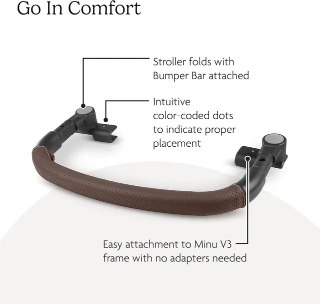 FeaturesCompatibility: Designed for the Minu V3 Stroller.Secure Strolls: The Minu V3 Bumper Bar provides additional comfort and protection for your child while strolling.Simple Attachment: Intuitive attachment with color-coded dots indicates proper placement on Minu V3 frame, no adapters are needed.Easy In & Out: Easily pivots down for simple loading and unloading of child.Premium Leather: Wipeable, REACH certified leather for easy clean-ups when messes happen.