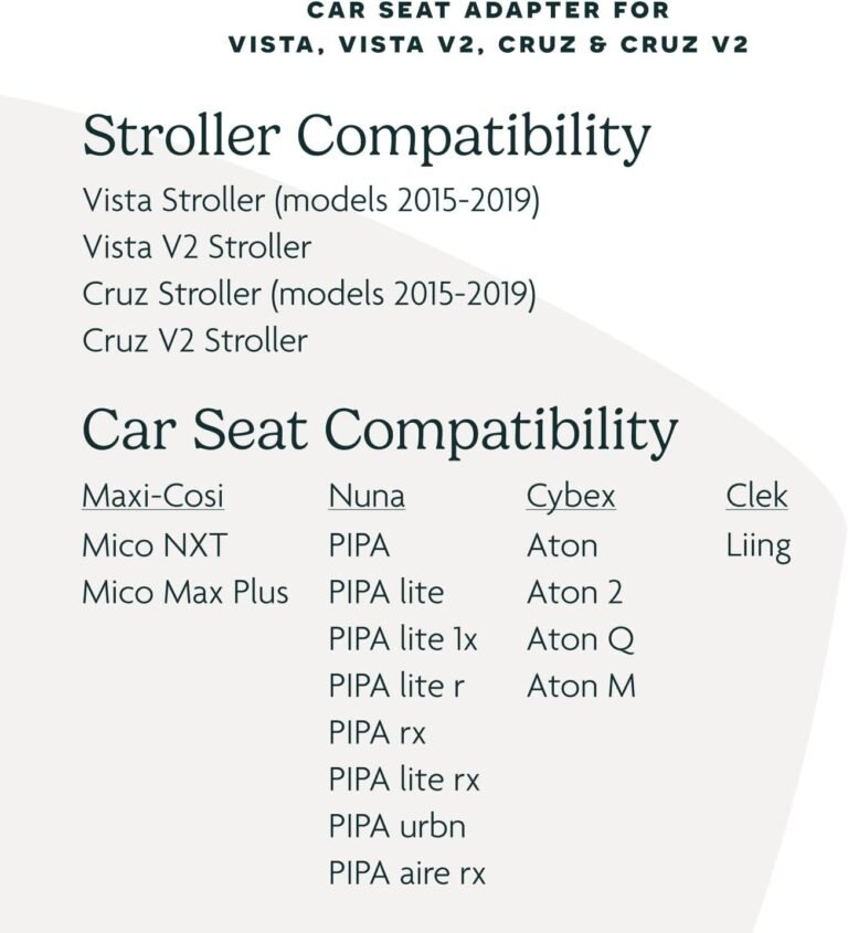 Compatible with Maxi-Cosi® Mico NXT, Mico Max Plus, Nuna® PIPA™ Aire Rx, Nuna® PIPA™, PIPA lite, PIPA lite lx, PIPA lite r, PIPA rx, PIPA lite rx, PIPA urbn, Cybex Aton, Aton 2, Aton Q, Aton M, Clek Liing